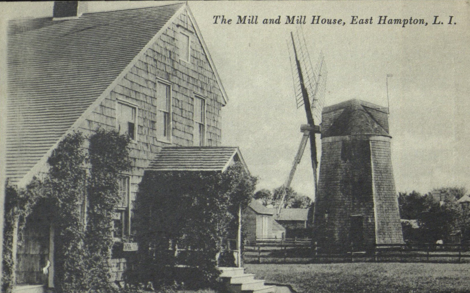 Postcard image of the Pantigo windmill and Home Sweet Home, in East Hampton, Long Island