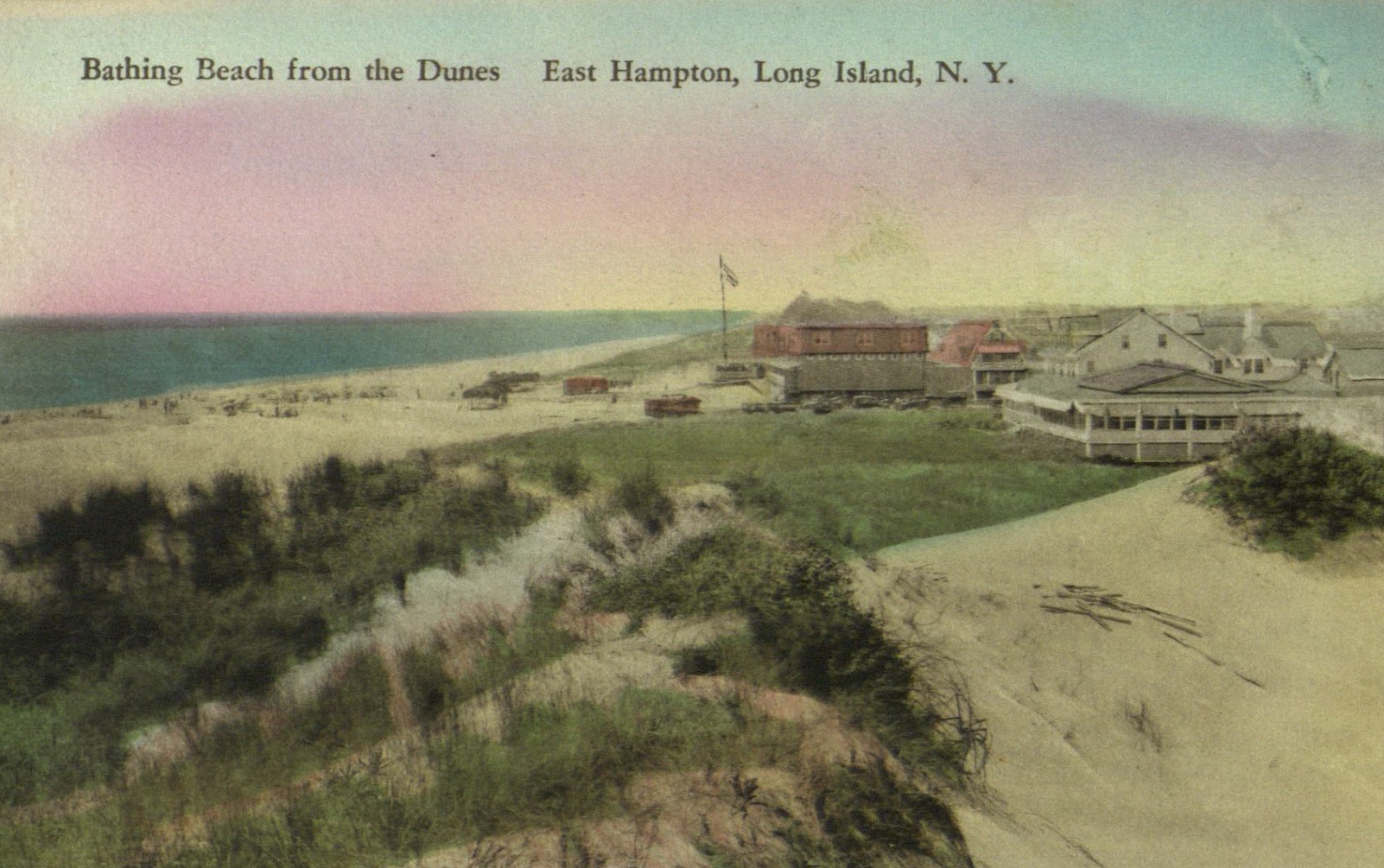 Postcard image shows view of the beach from the dunes, in East Hampton, L.I.