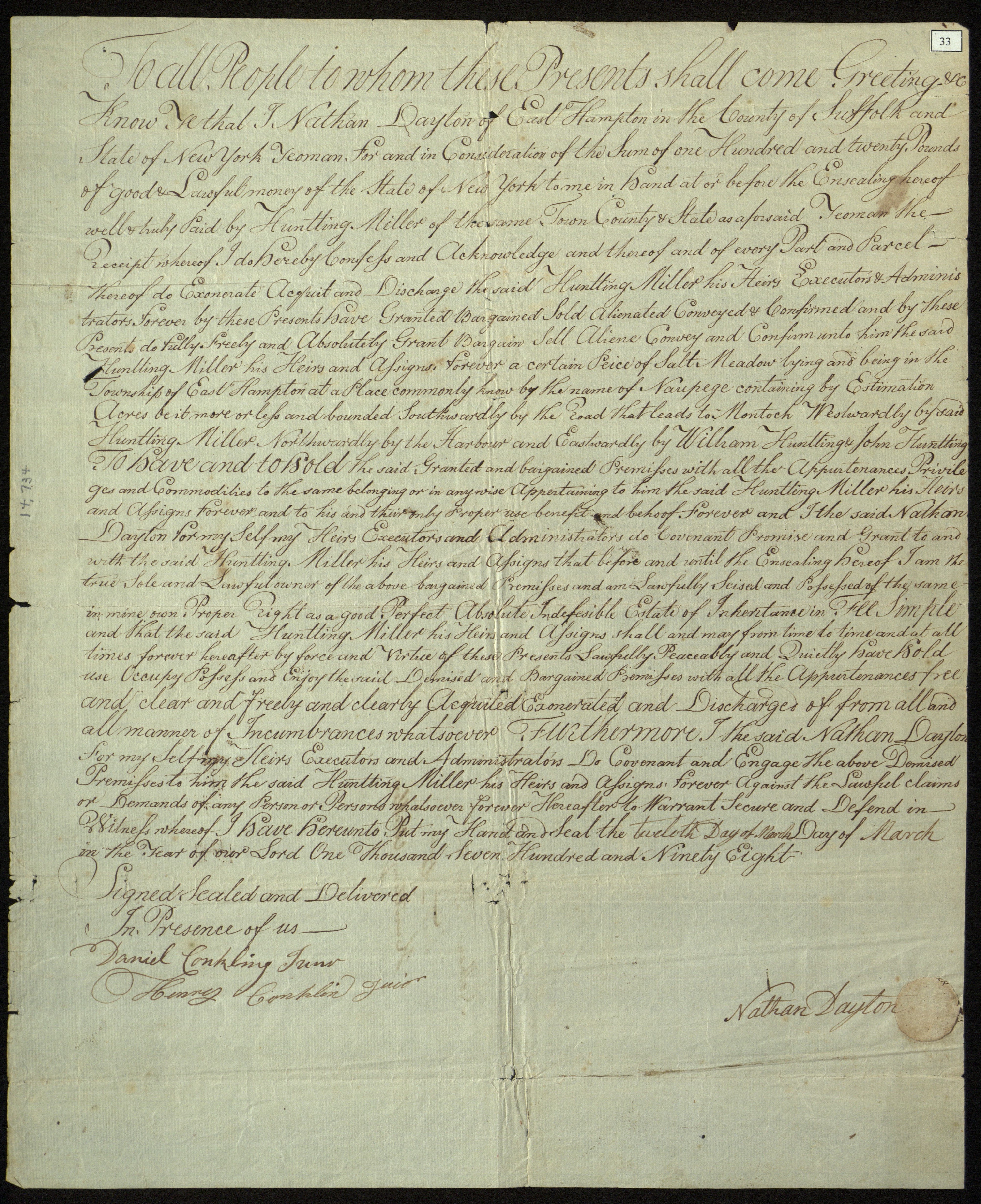 Sale of parcel of salt meadow at Napeague, in East Hampton Township, N.Y., by Nathan Dayton, yeoman, to Huntting Miller, yeoman, March 12, 1798.