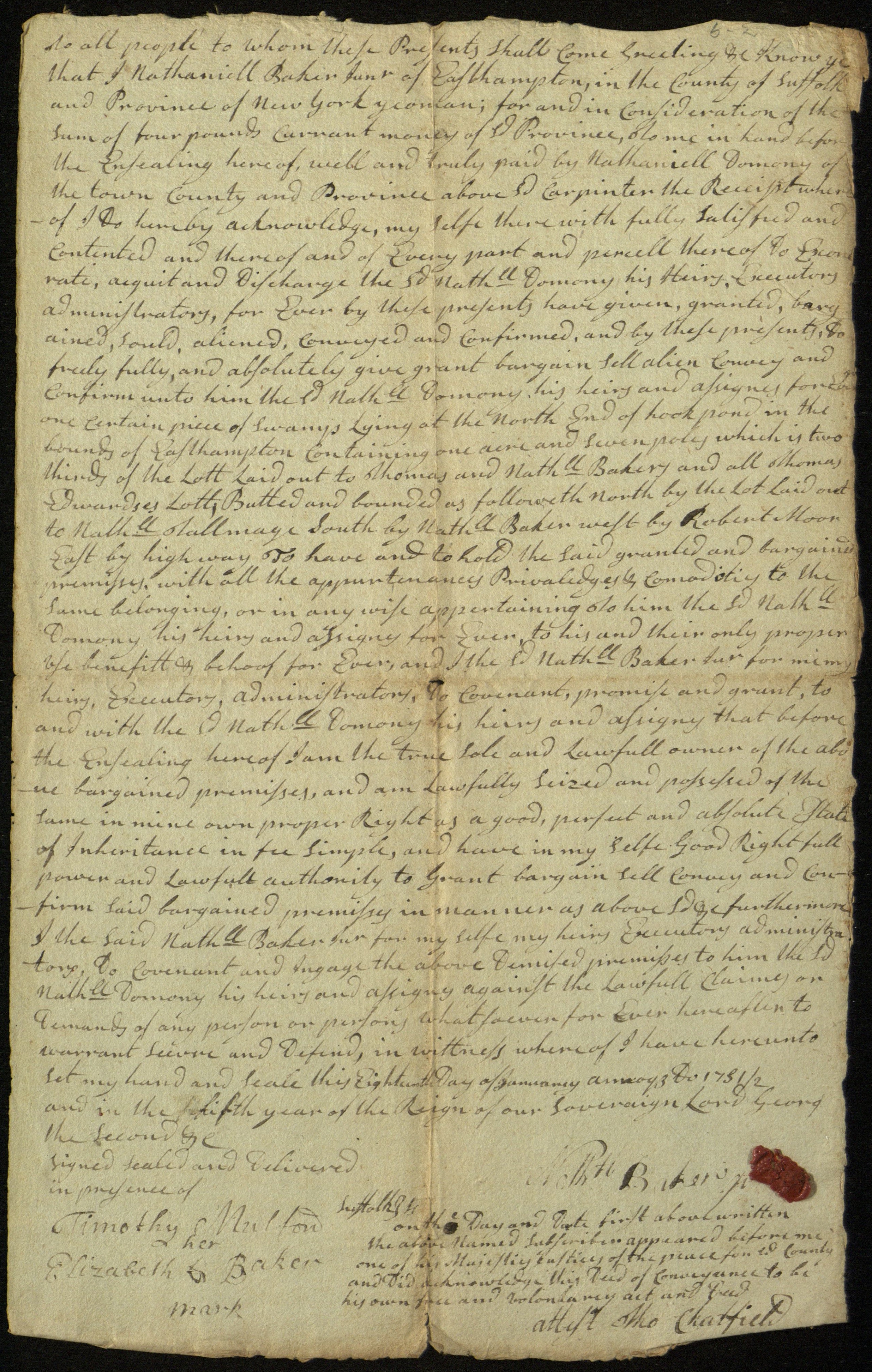 Deed to Nathaniel Dominy : swamp at North end of Hook Pond, East Hampton, N.Y., January 18, 1731/2