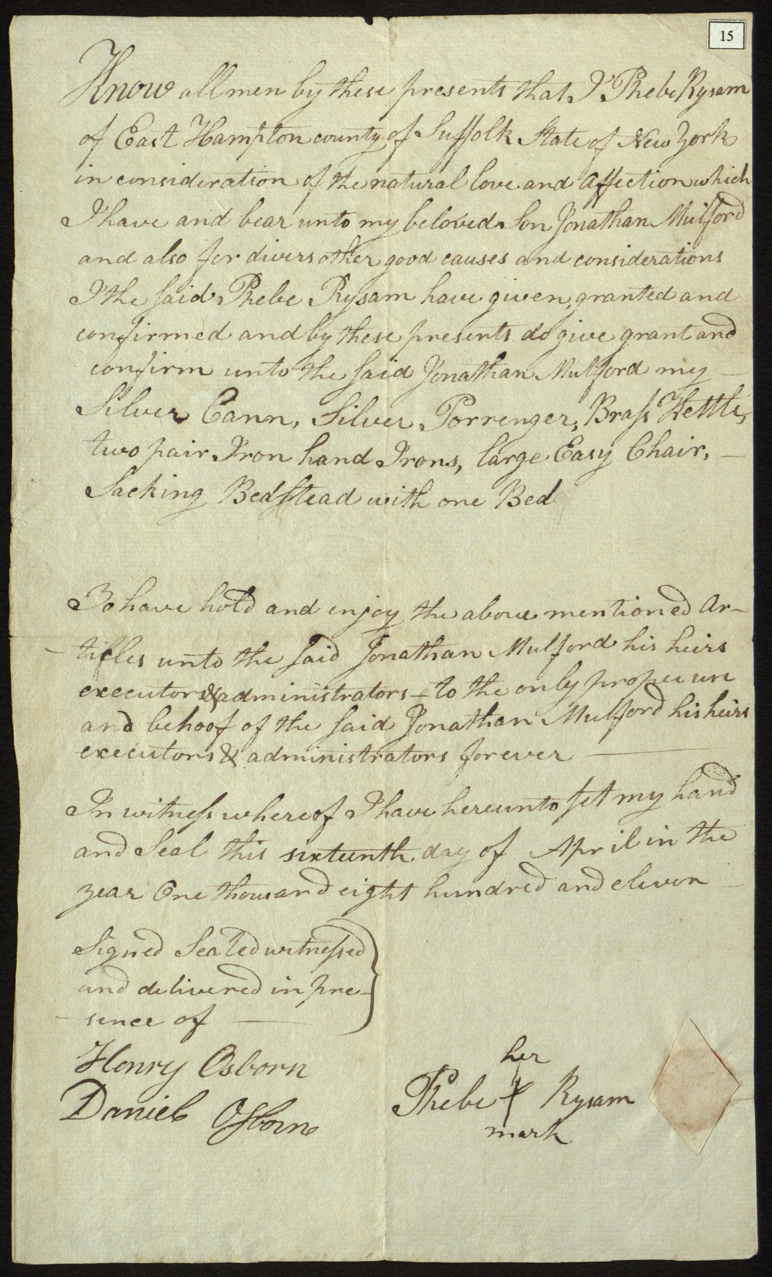 Deed of gift of household items and heirlooms from Phebe Rysam to her son, Jonathan Mulford, in East Hampton Township; April 16, 1811. Items gifted include silver can & porringer, brass kettle, iron handled irons, large easy chair, "sacking bedstead with one bed," witnessed by Henry Osborn and Daniel Osborn.
