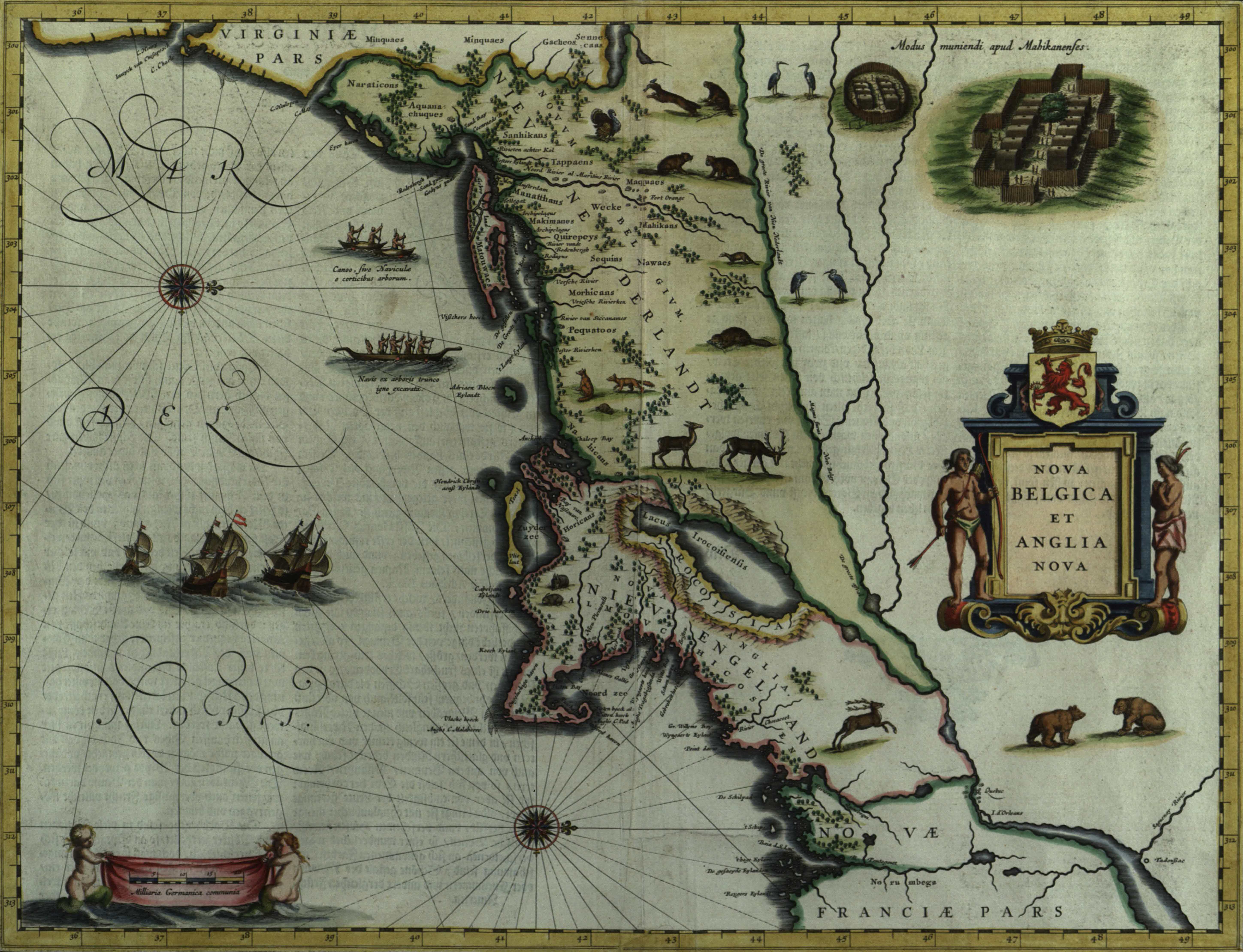 One of the earliest maps to include that part of North America, colonized by the Dutch. It is the first printed map showing Indian canoes and several kinds of North American fauna, such as turkeys, beavers, polecats and otters. The map exercised considerable influence for many years. Perhaps the first English settlers to come to East Hampton, used this map to find their way.