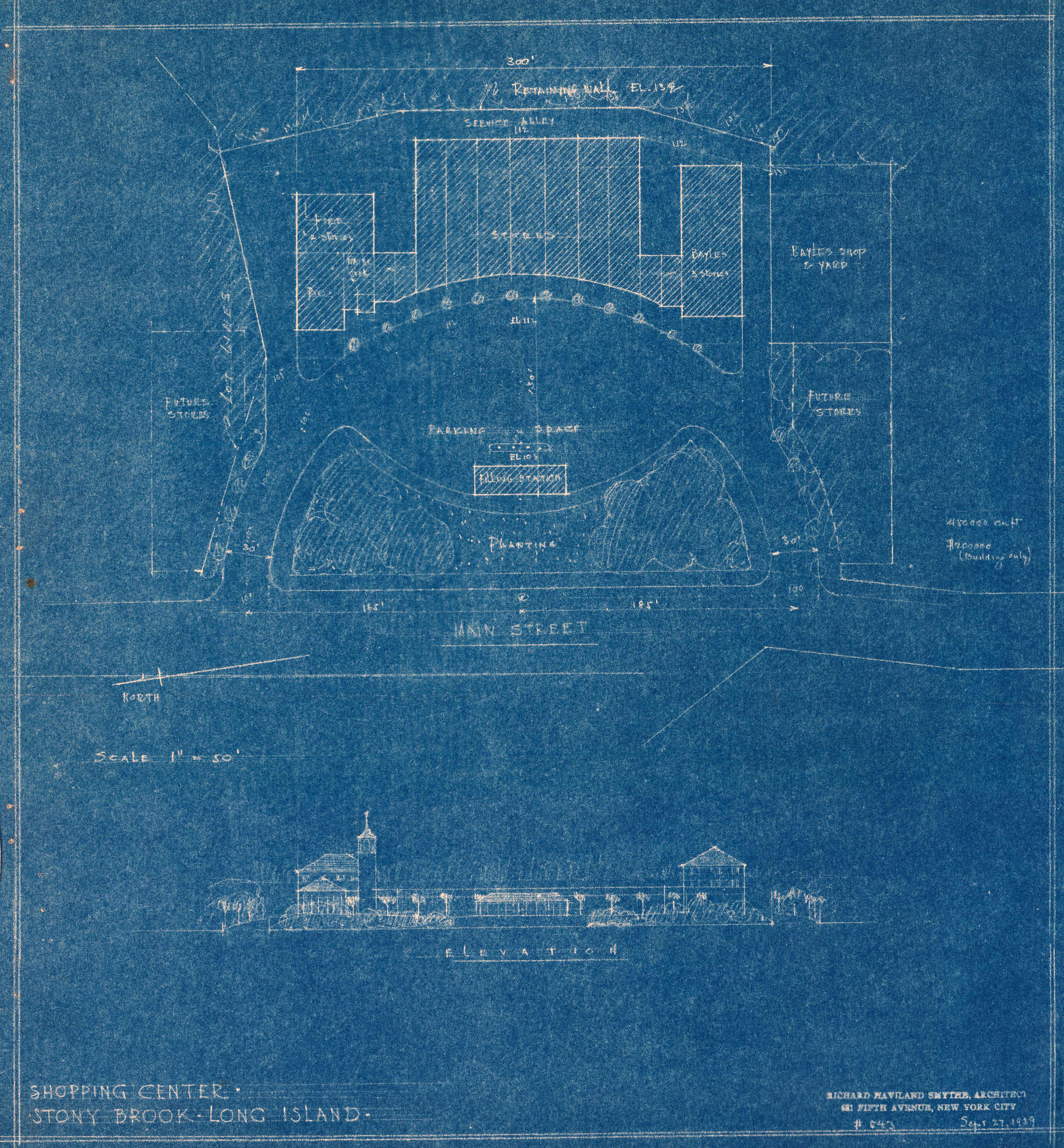 This blueprint shows the elevation and parking plans of a shopping center located in Stony Brook, L. I. This plan was completed by architect Richard Haviland Smythe, located at 681 fifth avenue, New York. Building for D.T. Bayles & Son.