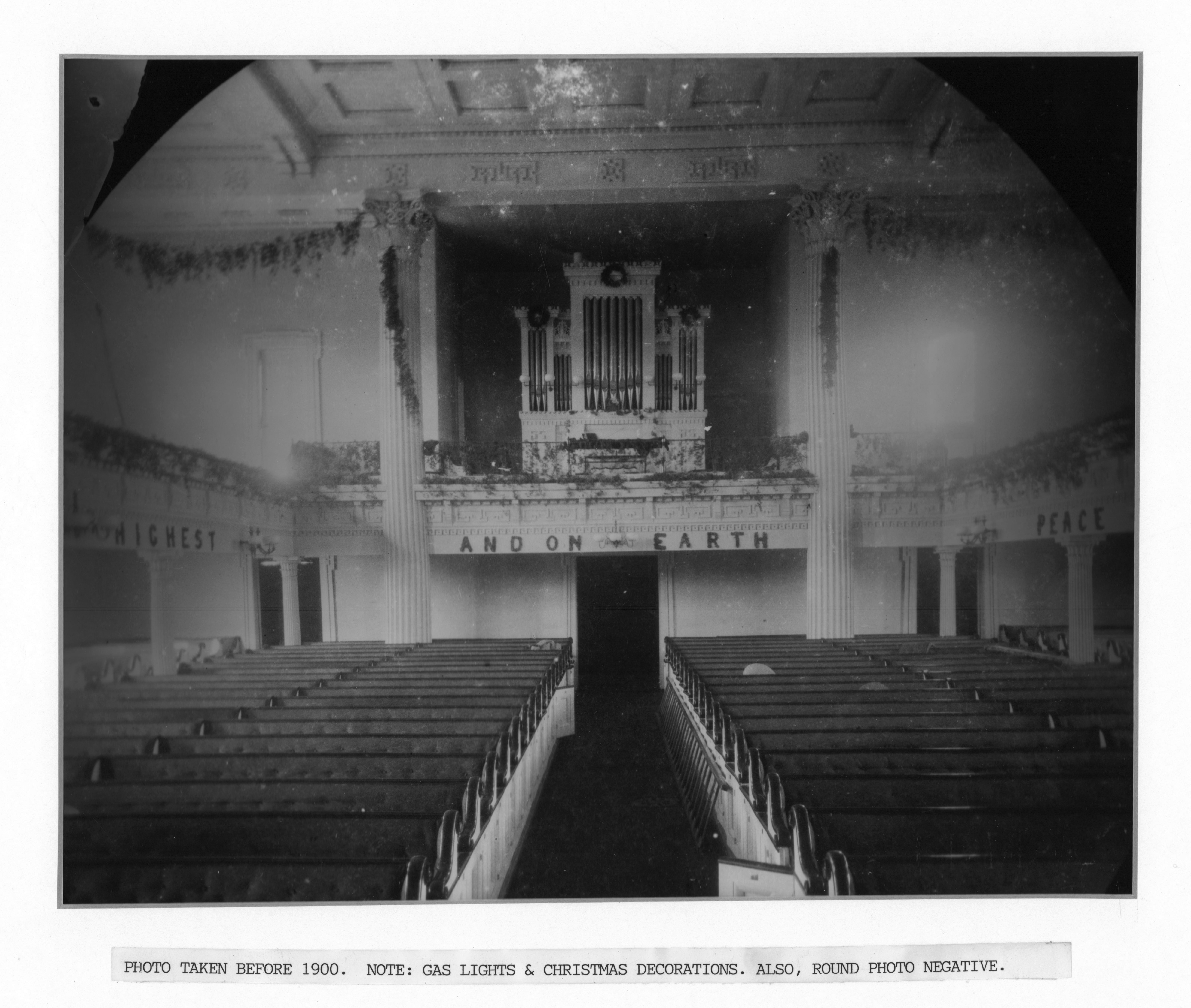 A date is estimated based on the use of round style photos, which were popular in the 1870s and 1880s. The gaslights would have also been popular during that time and a little later. This image shows the interior of the church in December, with Christmas decorations. Some of the Minard Lafever architectural details are visible, too.