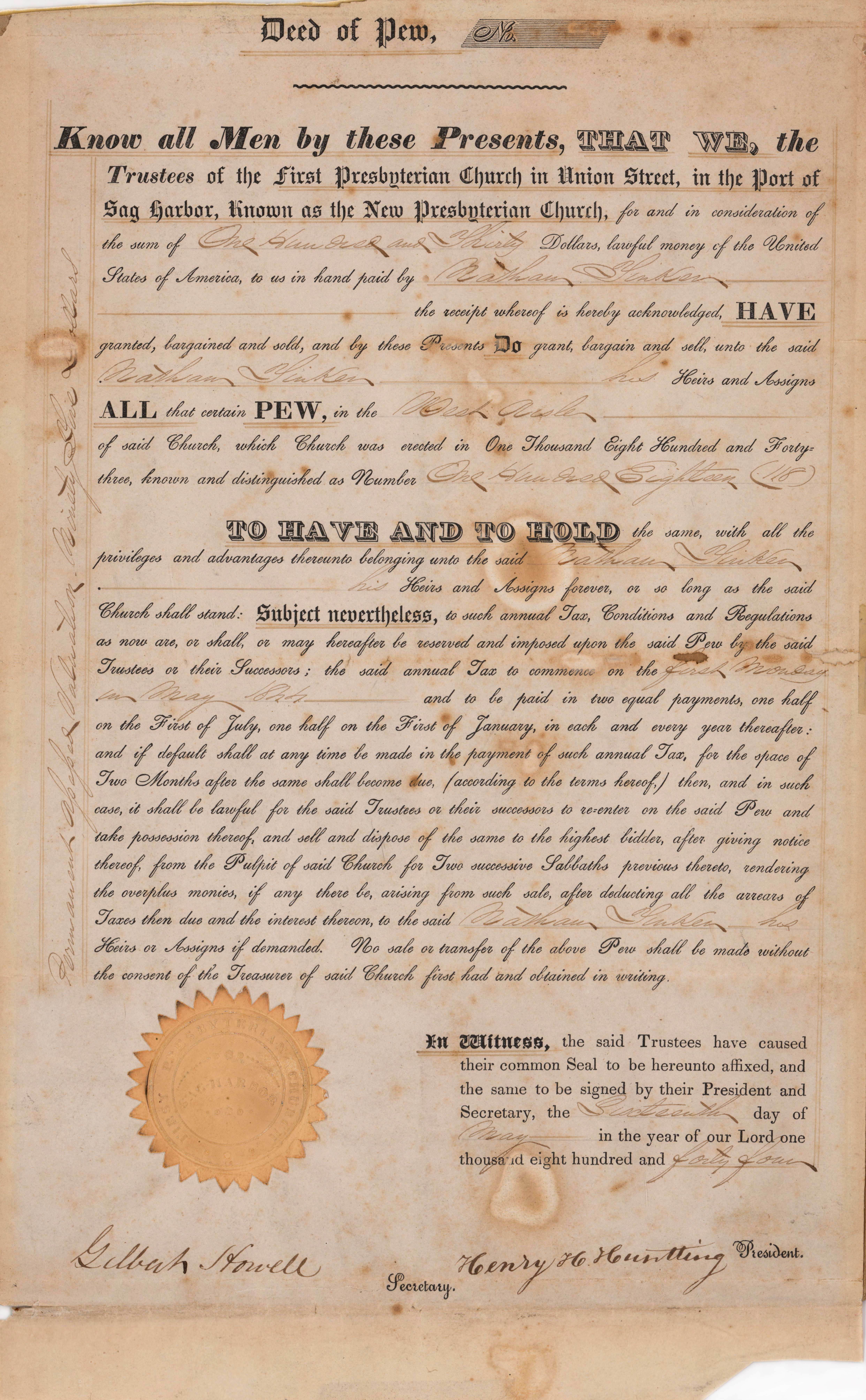 This pew deed from May 06, 1844 belonged to Nathan Tinker. He paid 130 dollars for his pew at the Sag Harbor First Presbyterian Church. Pews in a church could be paid for, typically as a subscription, in the 18th and 19th centuries.