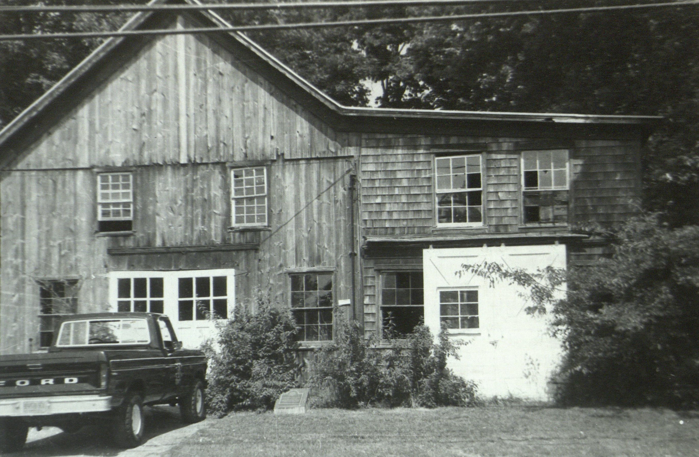 Caption on reverse reads: This building was the blacksmith shop of Charles S. Parsons of Springs. After his death in 1926, it stood empty for many years, subject to vandalism and decay, until acquired by the Springs Historical Society and moved to its present site, near Ashawagh Hall. Mr. Parsons was a man of rare mechanical ability. Besides blacksmithing work, his shop was also equipped with steam power from which all sorts of operations were performed. Two articles which appeared in the East Hampton Star in 1904 give an amusing account of his mechanical pioneering. "Charles Parsons, the Edison of Springs, will soon bring out something to excite the wonder and admiration of the people. He has taken a contract to build for Peter Koppelman, the progressive and wide awake vegetable man, an automobile wagon, from which will be sold vegetables throughout the town. The vehicle will be equipped with a five horsepower engine and will have regulation wagon wheels with steel tires. Both Mr. Parsons and Mr. Koppleman have confidence that the machine will be a success." Charles Parsons of Springs, has just turned out a credible piece of work in the shape of a wood sawing machine for W.L. Edwards, of Springs. The machine consists of a five horsepower engine connected to a buzz saw, all mounted on a four wheel truck. The truck is so heavy and the machinery so firmly mounted upon it, that Mr. Edwards can back it up to a pile of wood, and proceed to sawing immediately without any fuss about it. We understand the machine will be seen at work in this village next week." It is also worth noting that it was in this shop that his nephew, Ralph M. Parsons, whose international engineering achievements are well known, as a small boy, received his first introduction to mechanical works. Copy by C. Frank Dayton.
