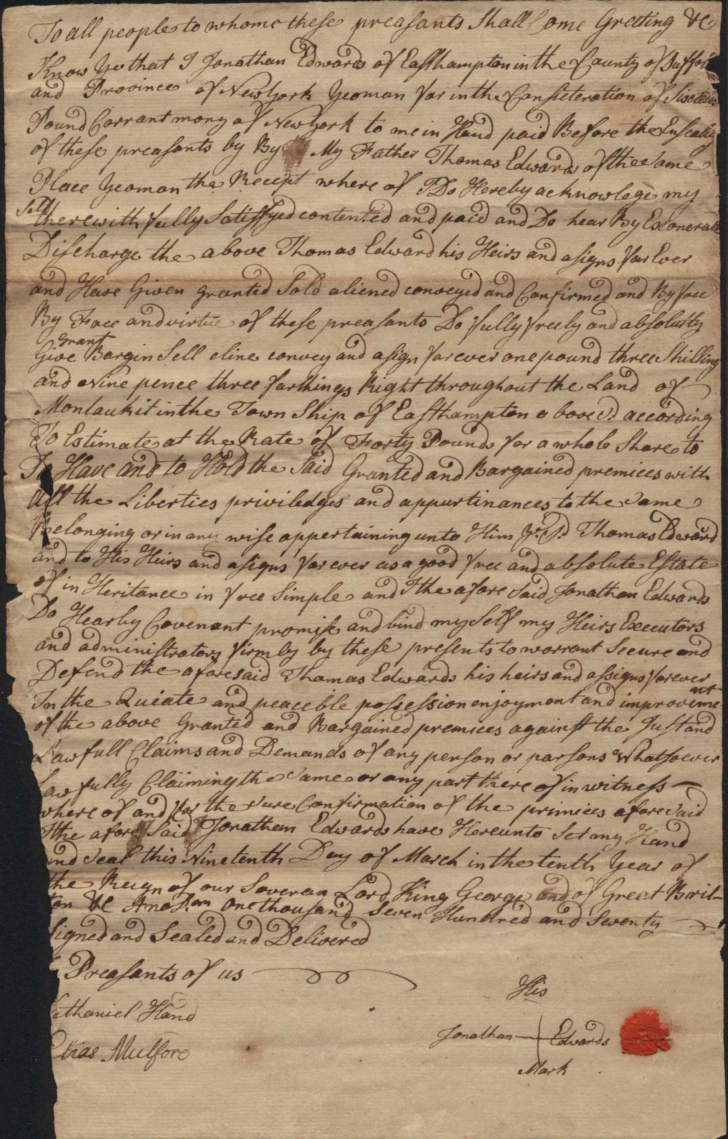 This indenture is between Jonathan Edwards and his father, Thomas Edwards, dated for March 19, 1770. This item is part of the Isaac Edwards Deed Collection, donated by Bess Rattray in December 2020.