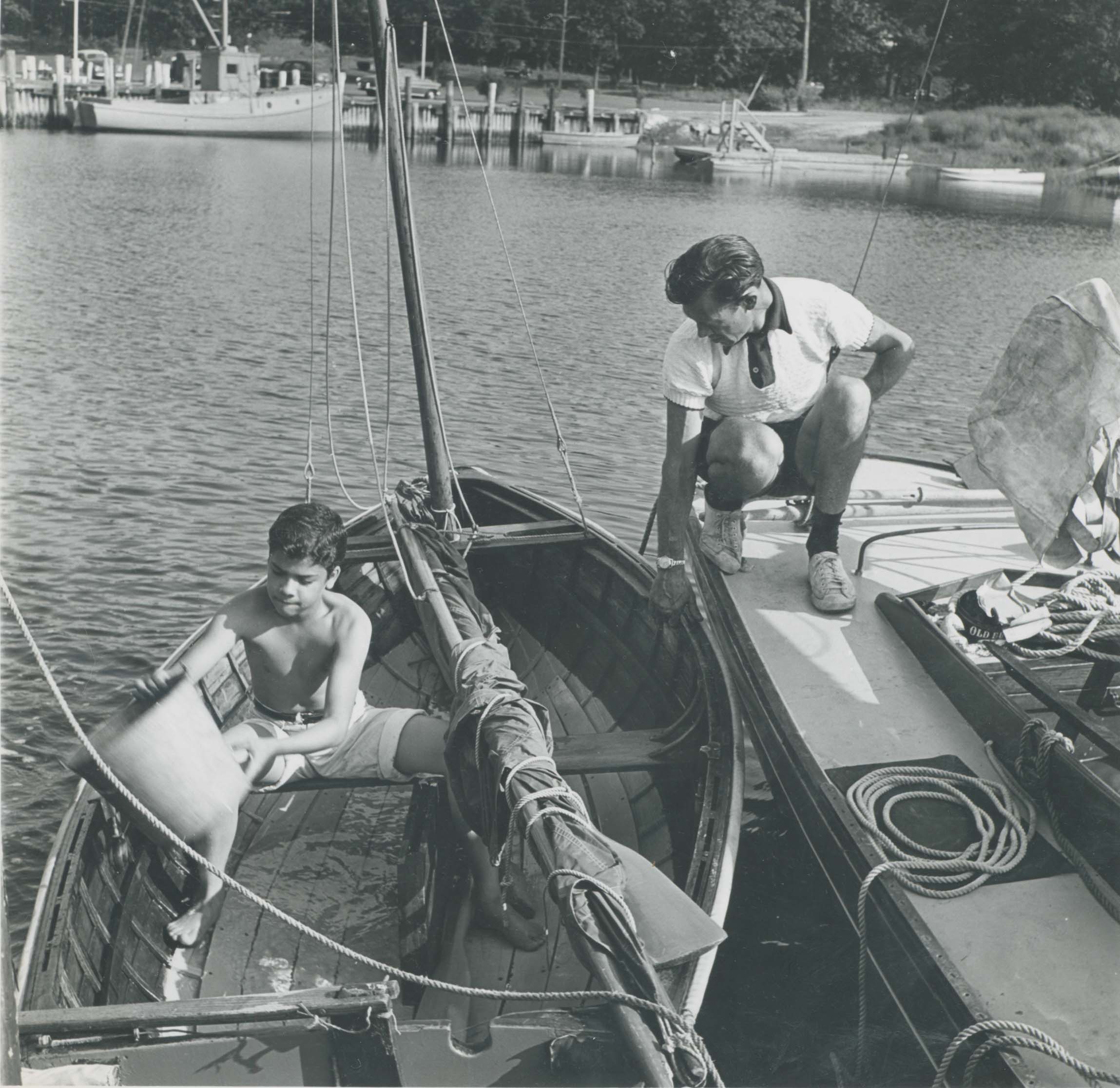 View of camper in sailboat with camp counselor in East Hampton, New York. Three Mile Harbor dock can be seen in background.
