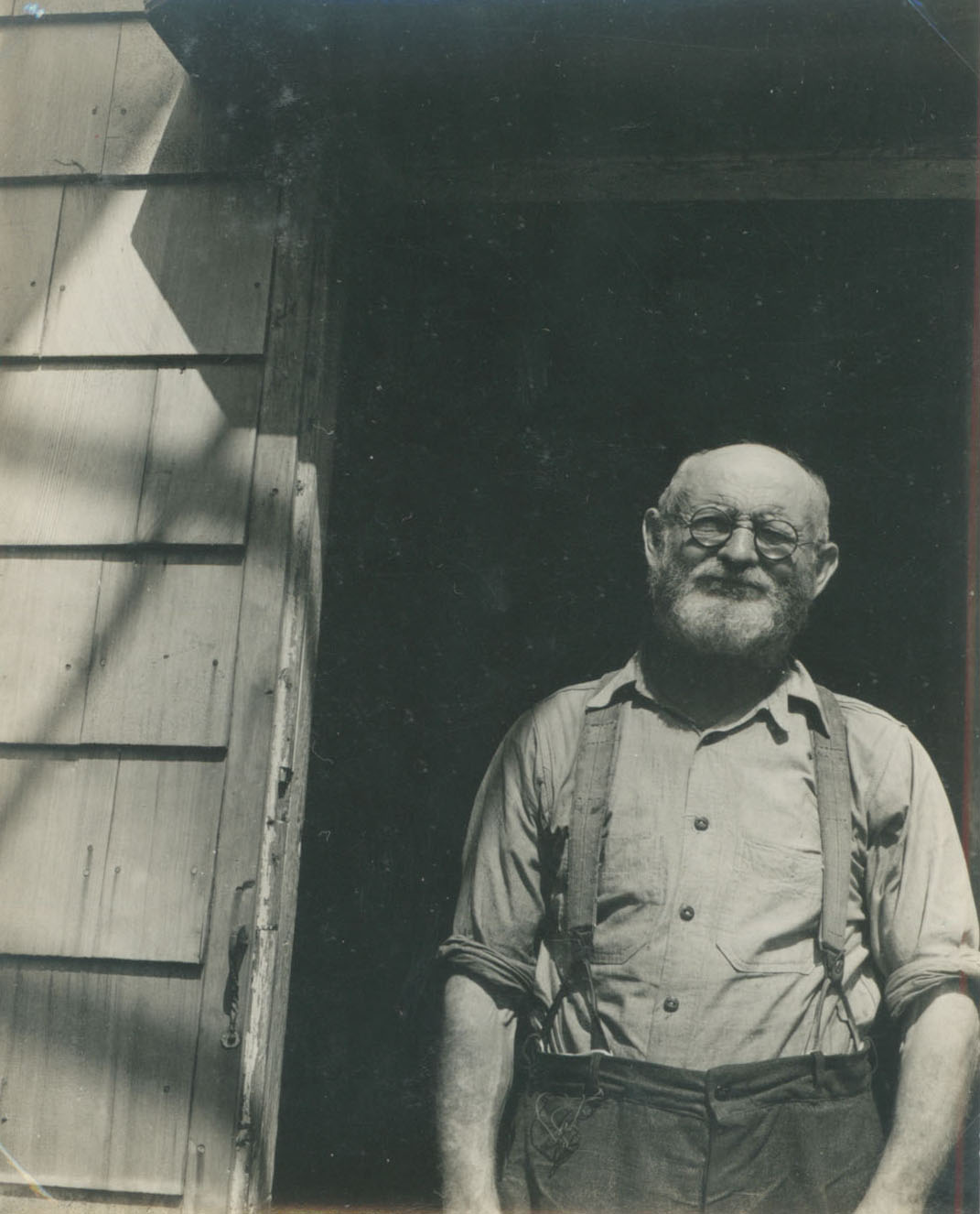 Charles "Puff" Dominy, standing inside doorway of Hook Mill, in East Hampton, L.I.