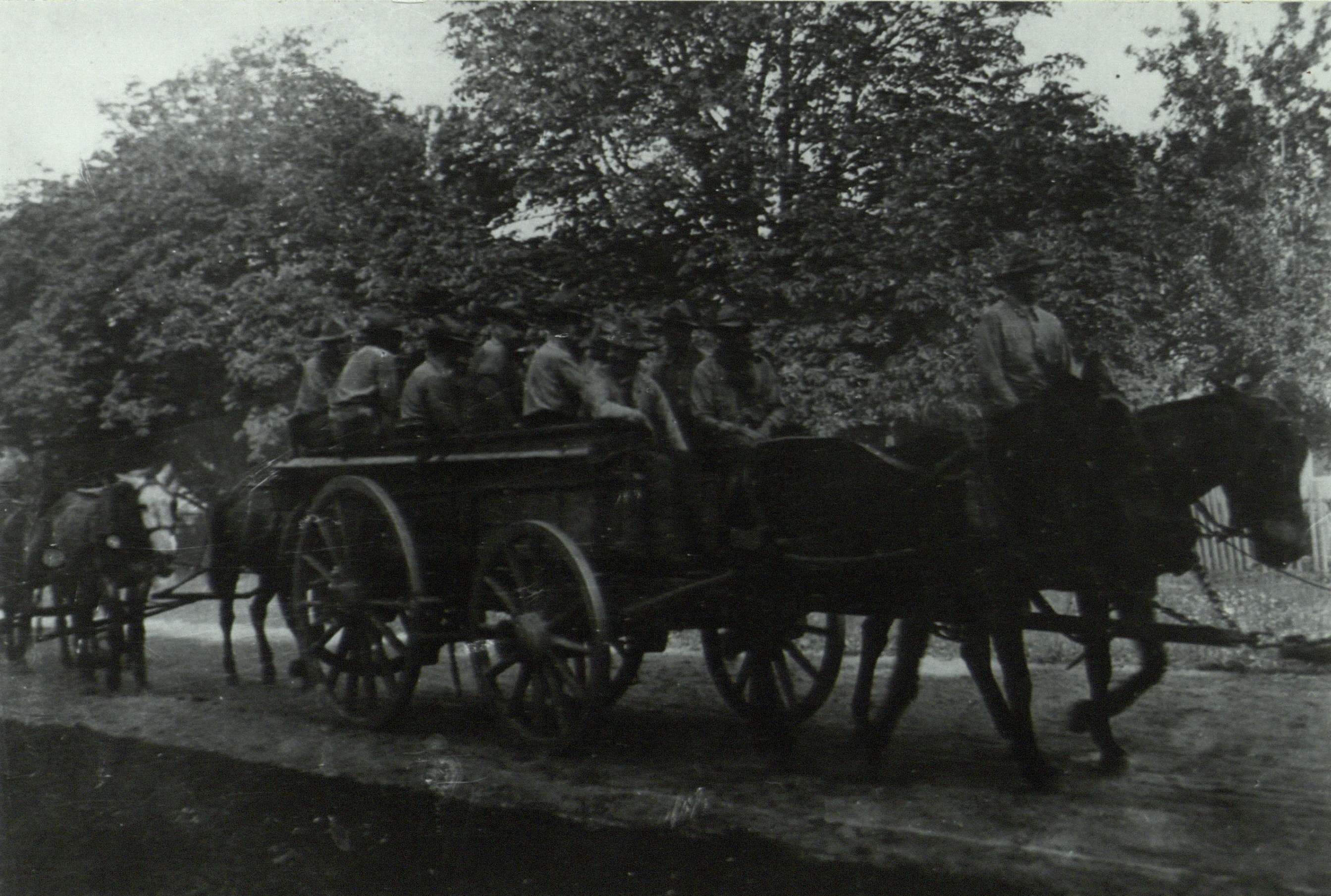 Caption on reverse reads: Spanish American soldiers passing through the village enroute to Montauk, 1898. Copy by C. Frank Dayton.