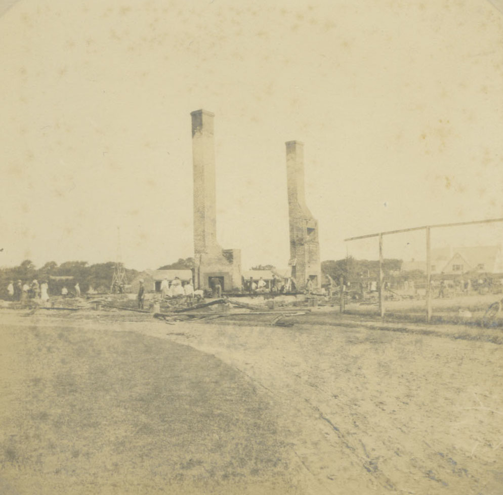 Maidstone Club after the fire. Chimneys of first clubhouse remain standing.