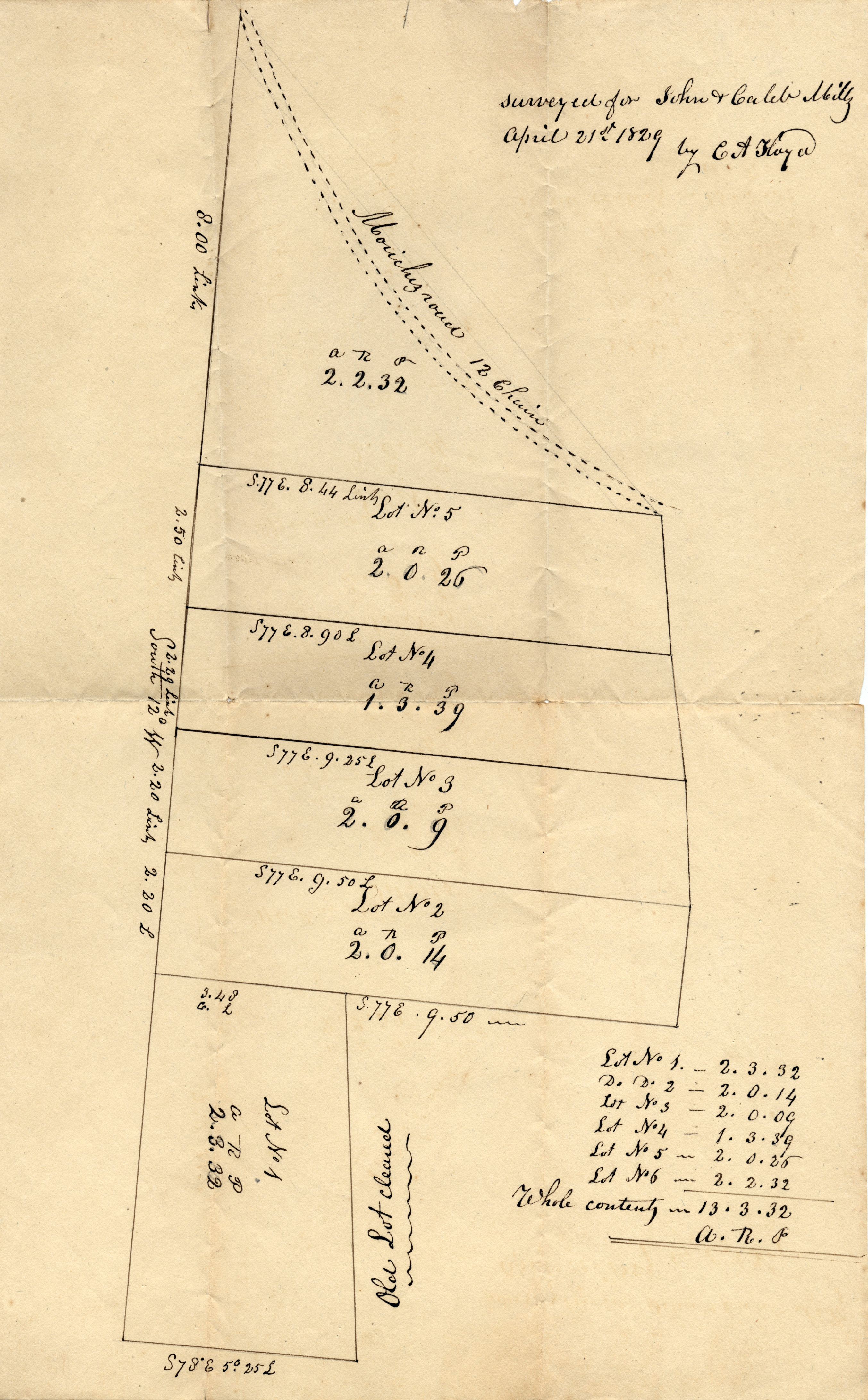 This is a survey map of property owned by John and Caleb Mills in what is now the town of Brookhaven. It was surveyed by Charles Albert Floyd, who would eventually serve in the U. S. House of Representatives. Dated April 21st, 1829.