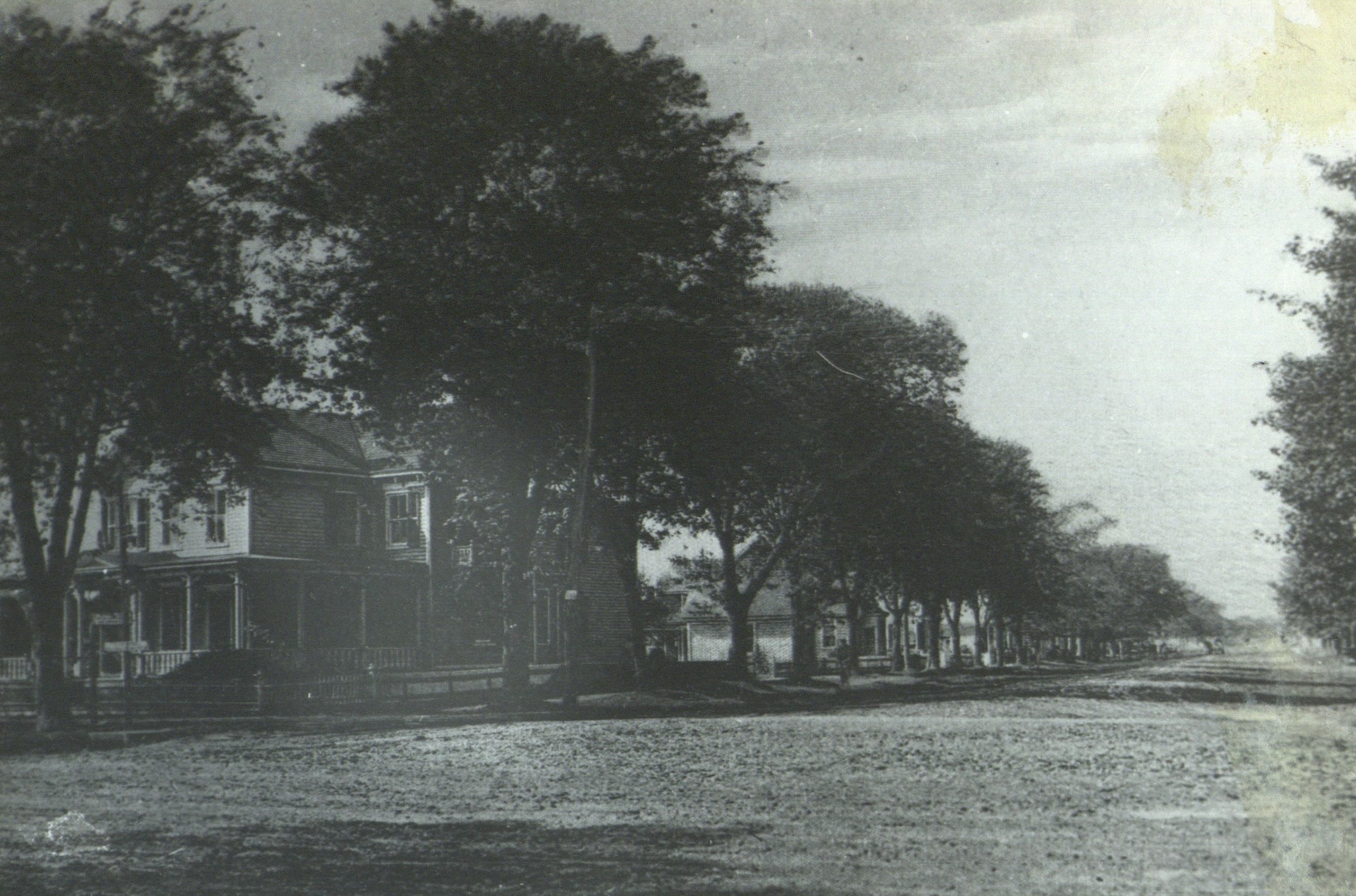 Caption on reverse reads: Looking North on Newtown Lane from Main Street corner. House at left is the former Christian Schenck home. It was removed to the corner of Church Street and Gingerbread Lane. Due to a fire in later years, it is much smaller today than when it stood on Main Street. Copy by C. Frank Dayton.,