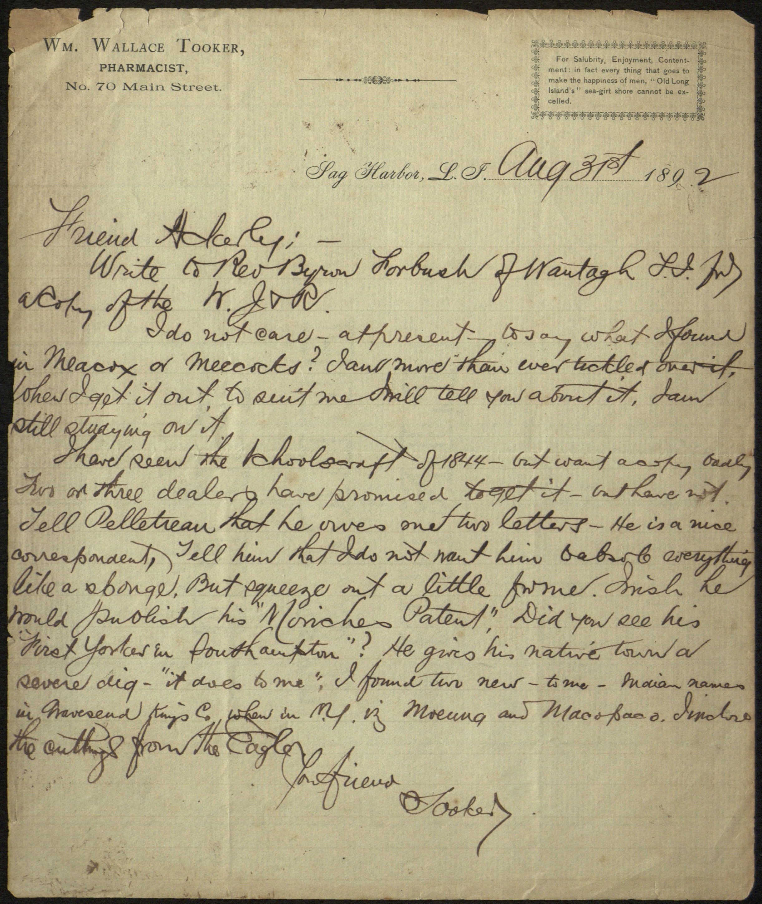 Handwritten letter by William Wallace Tooker to O.B. Ackerly. The letter is written on William Wallace Tooker's pharmacy letterhead from 70 Main Street in East Hampton, N.Y., and is of a personal nature, August 31, 1892.