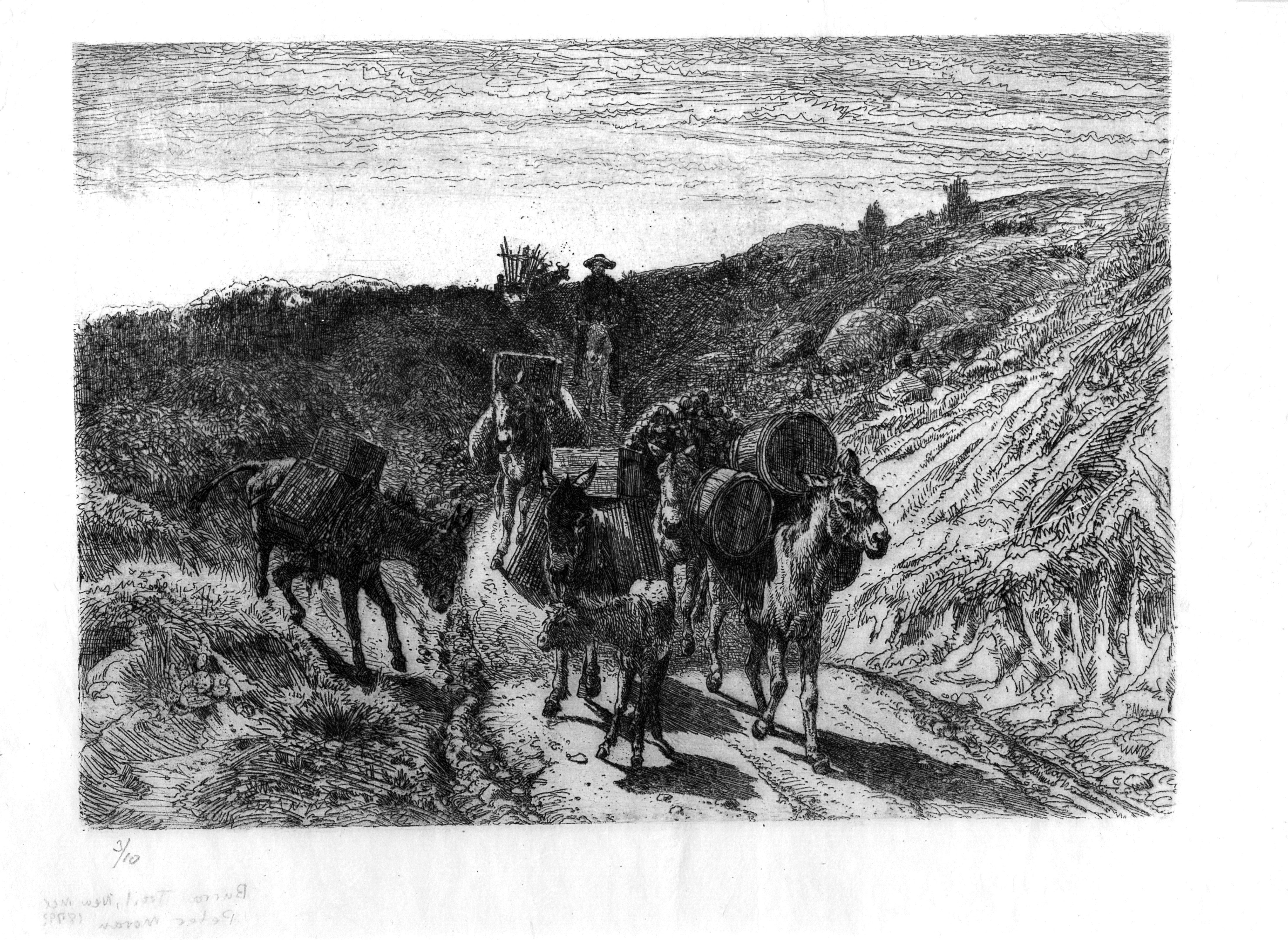 A print of "Burro Trail, New Mexico" by Peter Moran, copyrighted 1880.
