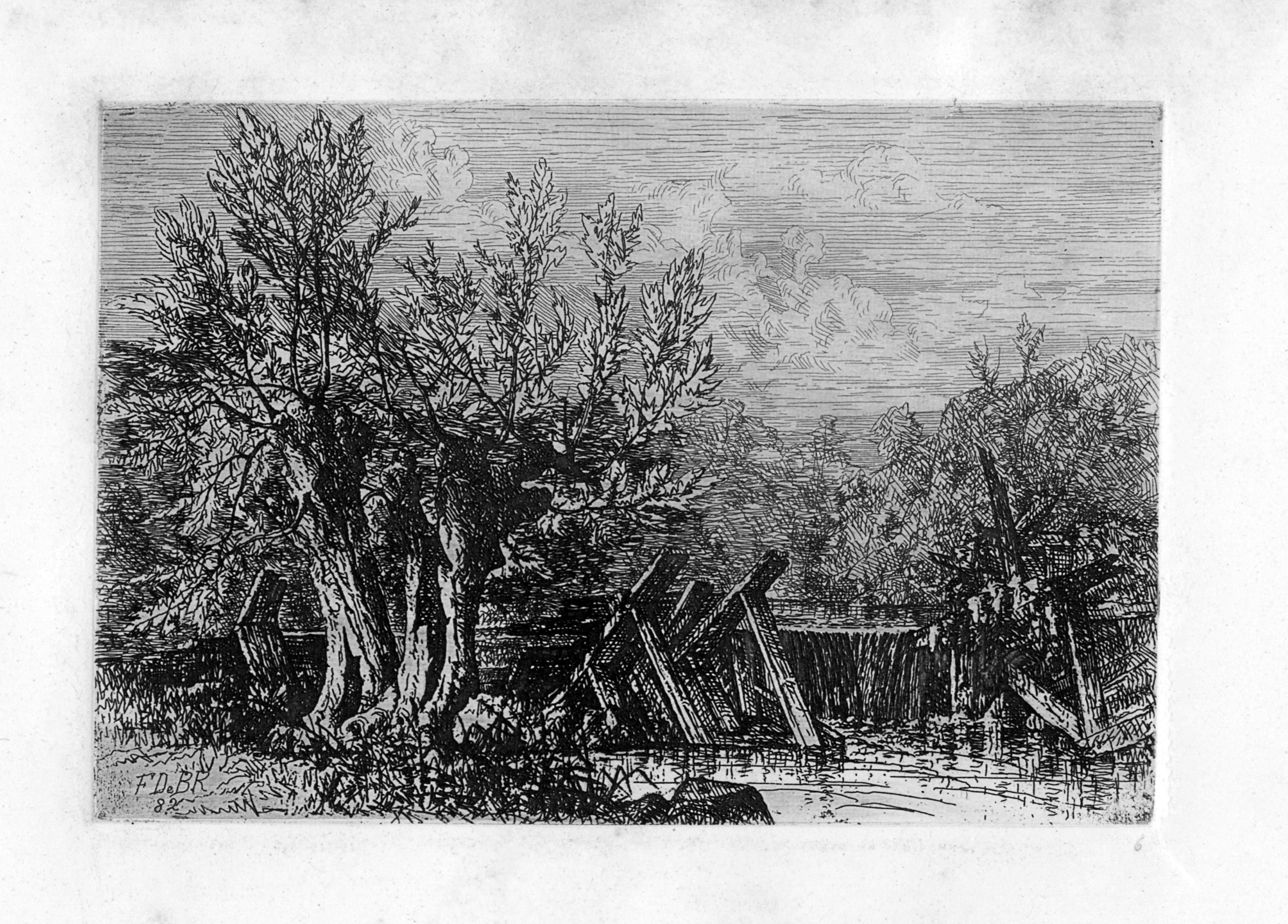 A print of "Old Dam Near the Juniata" by Frederick de Bourg Richards, copyrighted 1882. This image depicts a dam on the Juniata river, a river that runs through central Pennsylvania. This print comes from the personal collection of gallerist Christian Klackner, who printed etched reproductions of popular art for artists like Thomas Moran.
