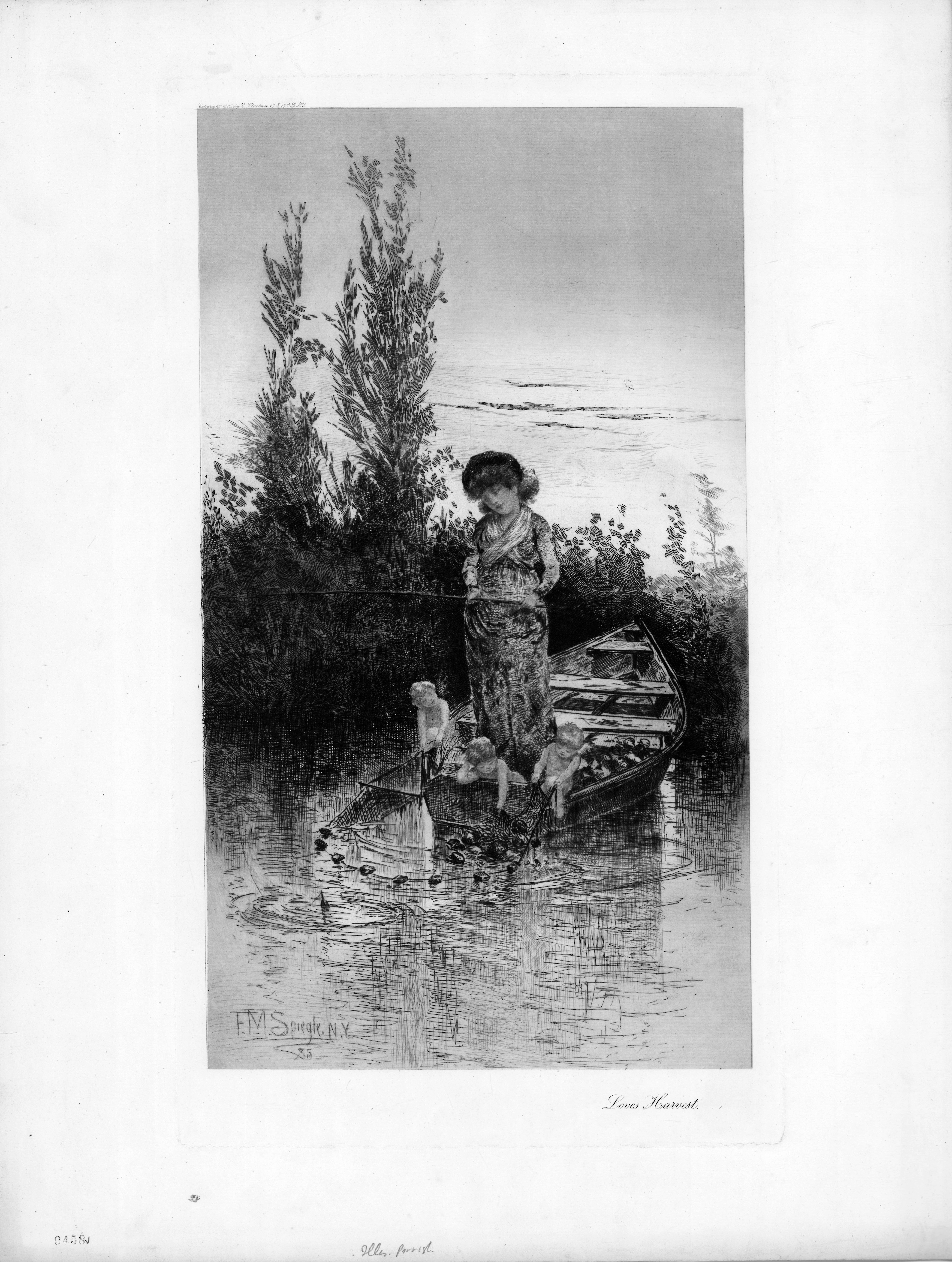 A print of "Love's Harvest" by Frederick M. Spiegle, printed by Christian Klackner, copyrighted 1885. This particular print was numbered as 9458 by the printer. This image depicts a young woman fishing in a pond from a rowboat. She is surrounded by three cherubs or cupid-like figures who are pulling a fishing net onto the boat. This image is likely a visual metaphor for a woman seeking romance. This image was printed by Christian Klackner, who created reproductions of many artist's works, including Thomas Moran.
