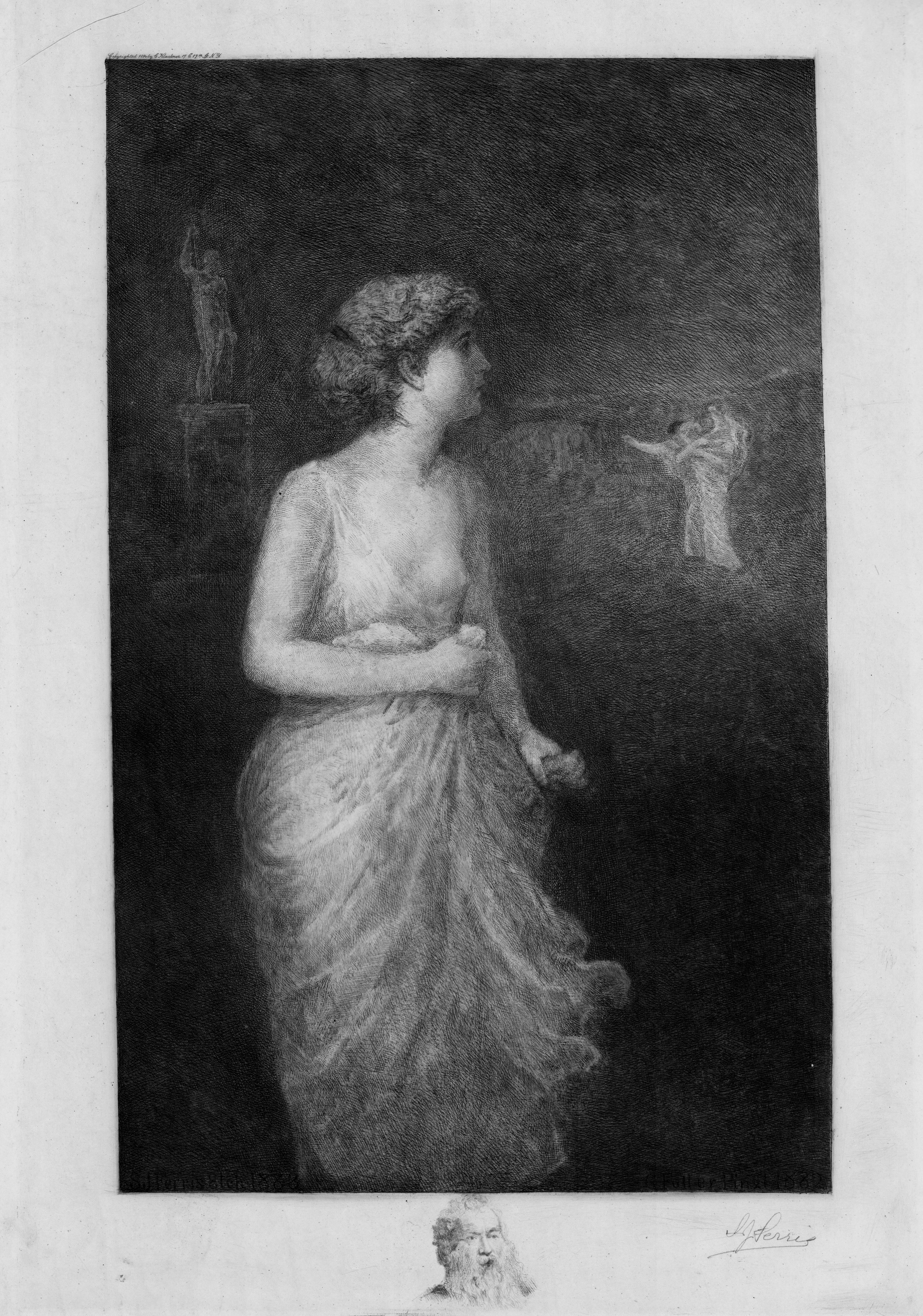 Print of George Fuller's Nydia. Copyrighted 1884. Print signed by etcher. Remark of a head of a bearded man. This is likely a depiction of a character of the same name from the popular novel "The Last Days of Pompeii" by Edward Bulwer-Lytton. In the novel, the blind Nydia attempts to lead two companions out of a burning Pompeii using hearing alone.