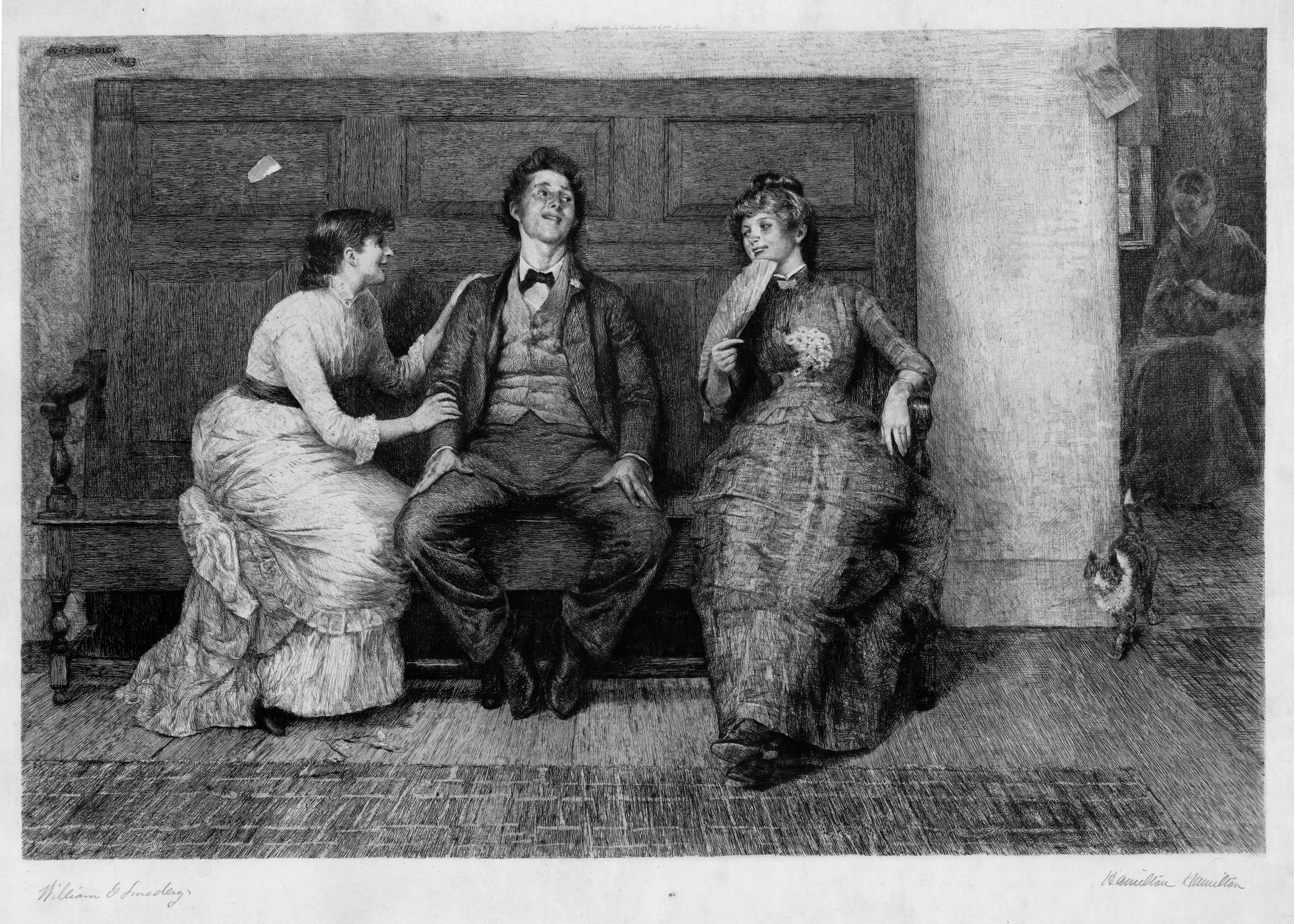 Print of William T. Smedley's Between Two Choices. Copyrighted 1884. Signed by artist on bottom left. Signed by etcher on bottom right. The image depicts a grinning man seated between two women on a bench. A third female figure can be seen through a doorway on the right of the image. This image came from the personal collection of Christian Klackner a printer and gallerist who produced and sold art reproductions for artists like William Thomas Smedley and Thomas Moran.