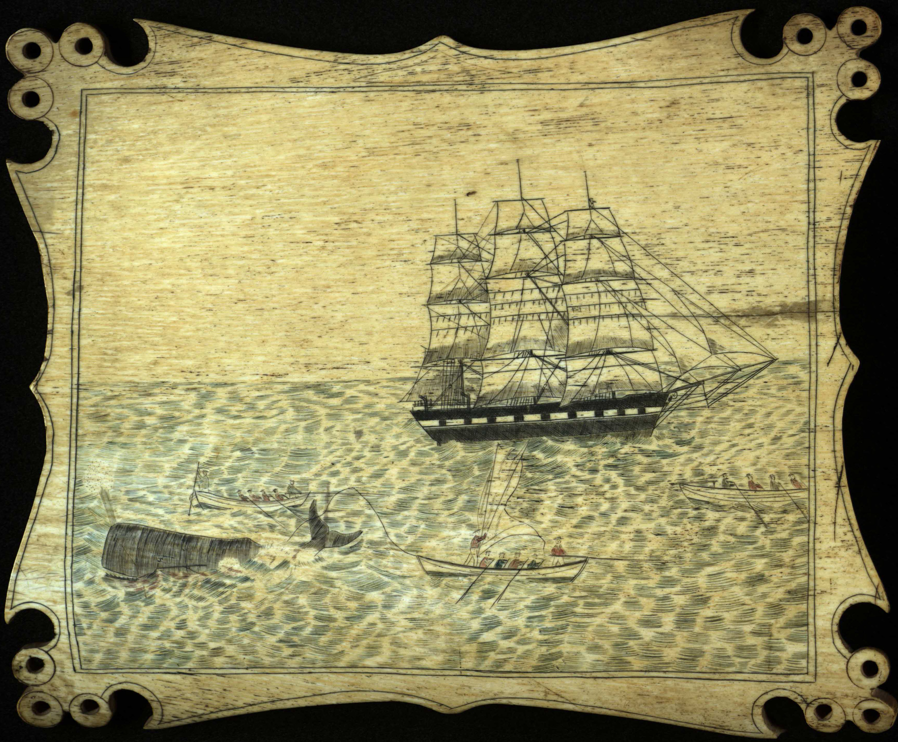 This scrimshaw image on a whale pan bone depicts whalers pursuing a whale on a whaleboat, with their ship in the background. The pan bone is carved by hand. This was purchased as part of a collection of whaling items, the Captain Philetus Pierson Whaling Collection. Not all of the items in the collection were created by Philetus Pierson (1801-1879), but some of the items were. Dates are estimated based on the height of the whaling industry and Captain Philetus Pierson's life.