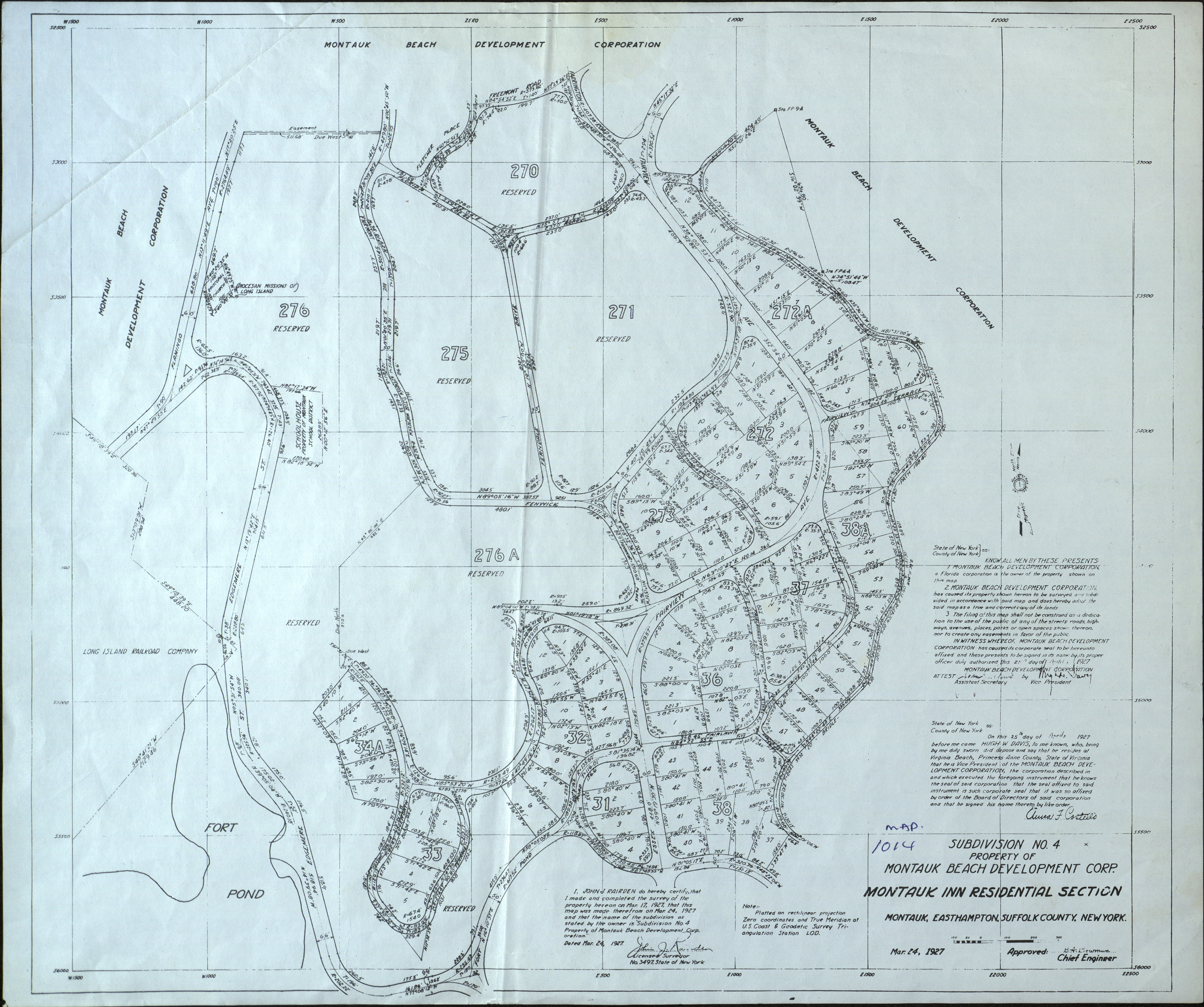 This plan is labeled "Subdivision No. 4, Montauk Beach Development Corp., Montauk Inn Residential Area, Fort Pond Business Section, Mar. 14, 1927, map no. 1014." The survey was drawn by John J. Rairden. Visible on the map are Montauk School House, the Diocesan Missions of Long Island, and the Episocopal Church. The area shown goes from Farrington Road through Edgemere Avenue, Fairview Terrace, and Fort Pond Boulevard.
