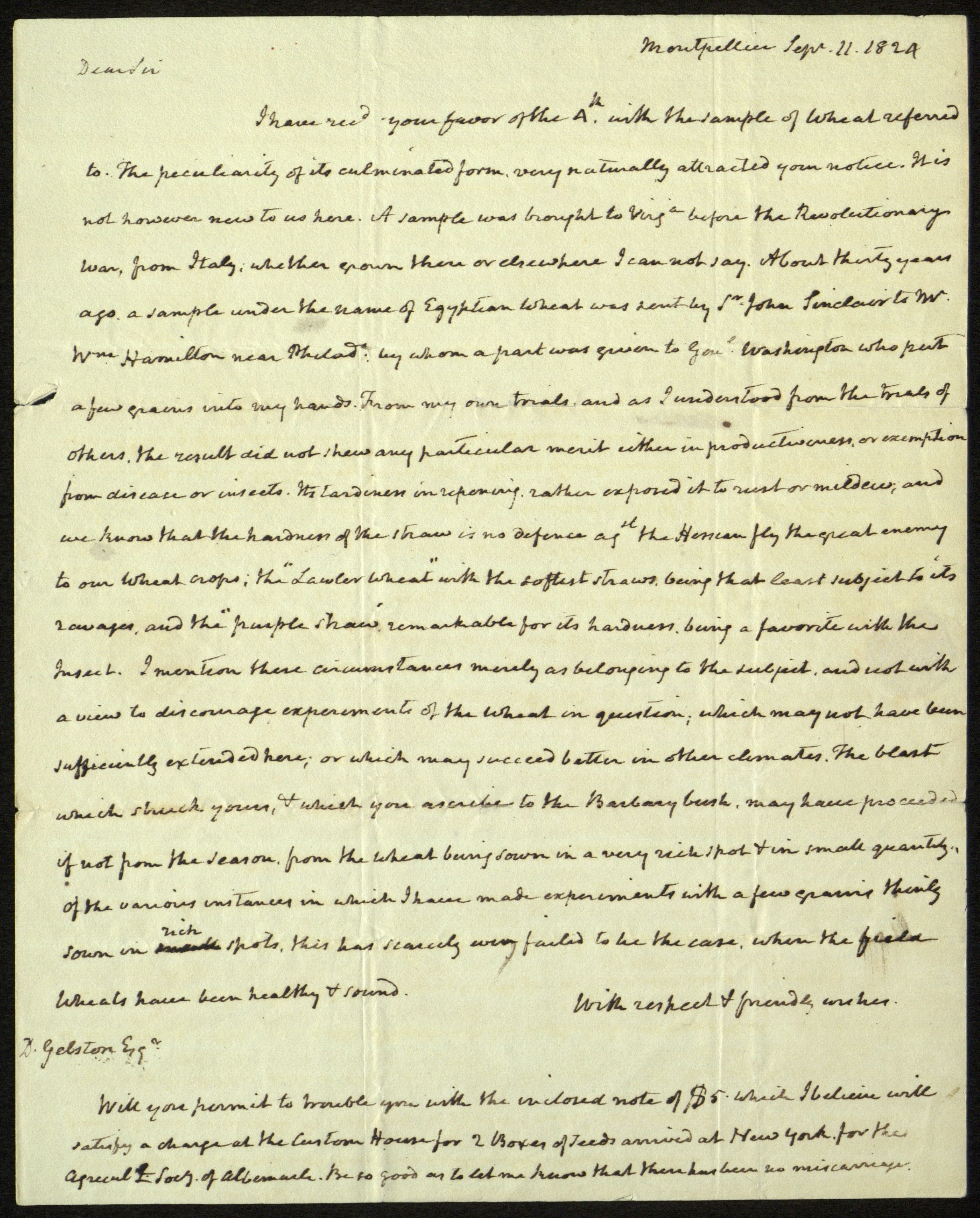 Letter to David Gelston (1744-1828), Collector of the Port of New York (1801-1820), from James Madison, September 11, 1824. [David Gelston was a native of Bridgehampton, the son of Maltby Gelston, who was chairman of the Committee of Safety of Suffolk. David Gelston was sent by his father, to Governor Trumbull of Connecticut to ask for a part of the Connecticut Militia to defend Long Island. He also was a member of the 2nd, 3rd, and 4th provincial congresses, and was one of the petitioners for a wharf at Sag harbor.]