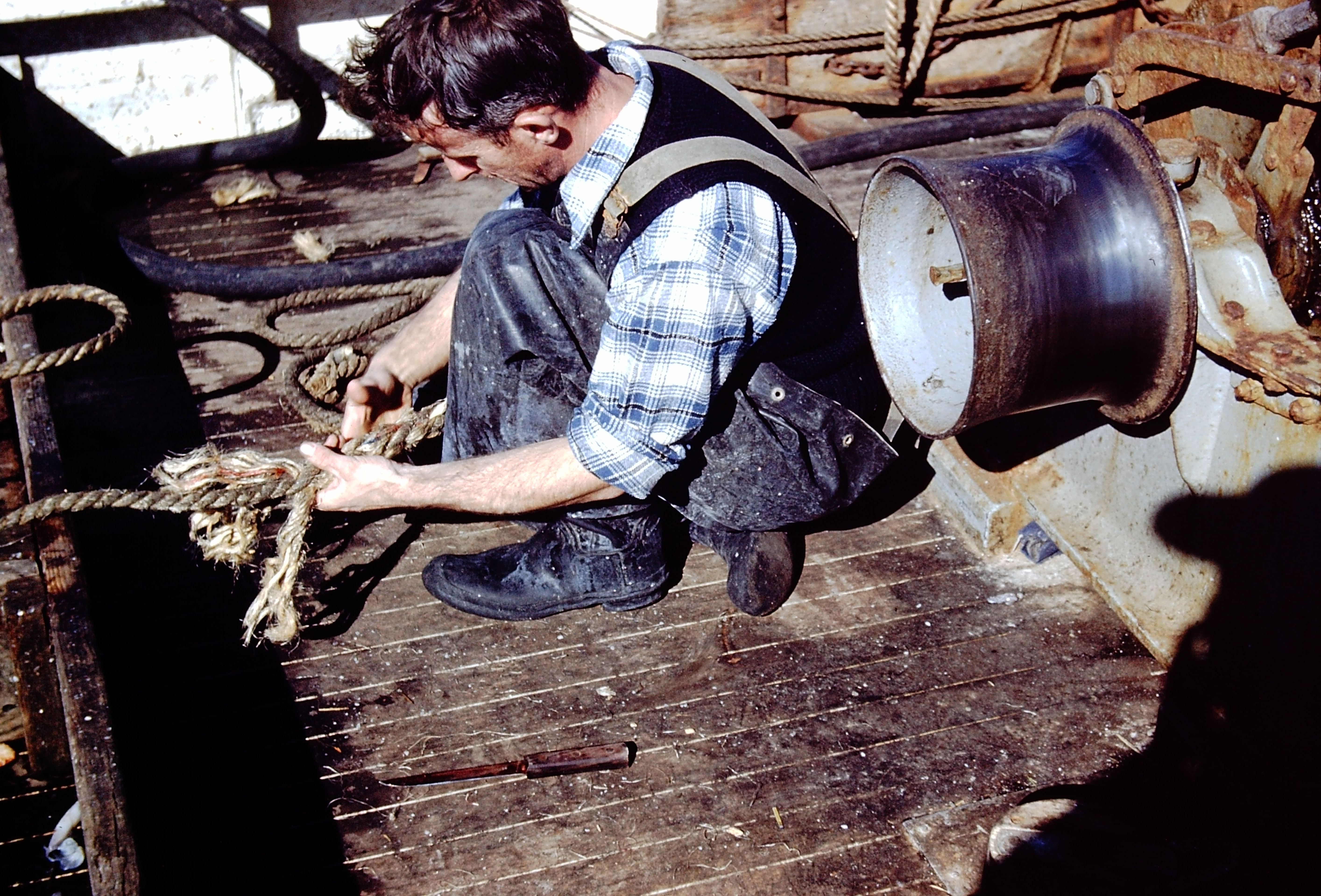 This image was presumably taken on a bunker boat, and it may have been taken during a Winter sojourn to Southern waters in North Carolina or Florida, based on other images of George Payne and David S. Miller in this same collection. Miller may have been on the Malolo, another bunker boat that fished out of Promised Land. In his History Project, Inc. oral history, Bruce Collins told interviewer Tony Prohaska that he piloted the steamer Shinnecock out of Amagansett for Jack Edwards from 1954 until 1960. That date is used to estimate the date for these images.
