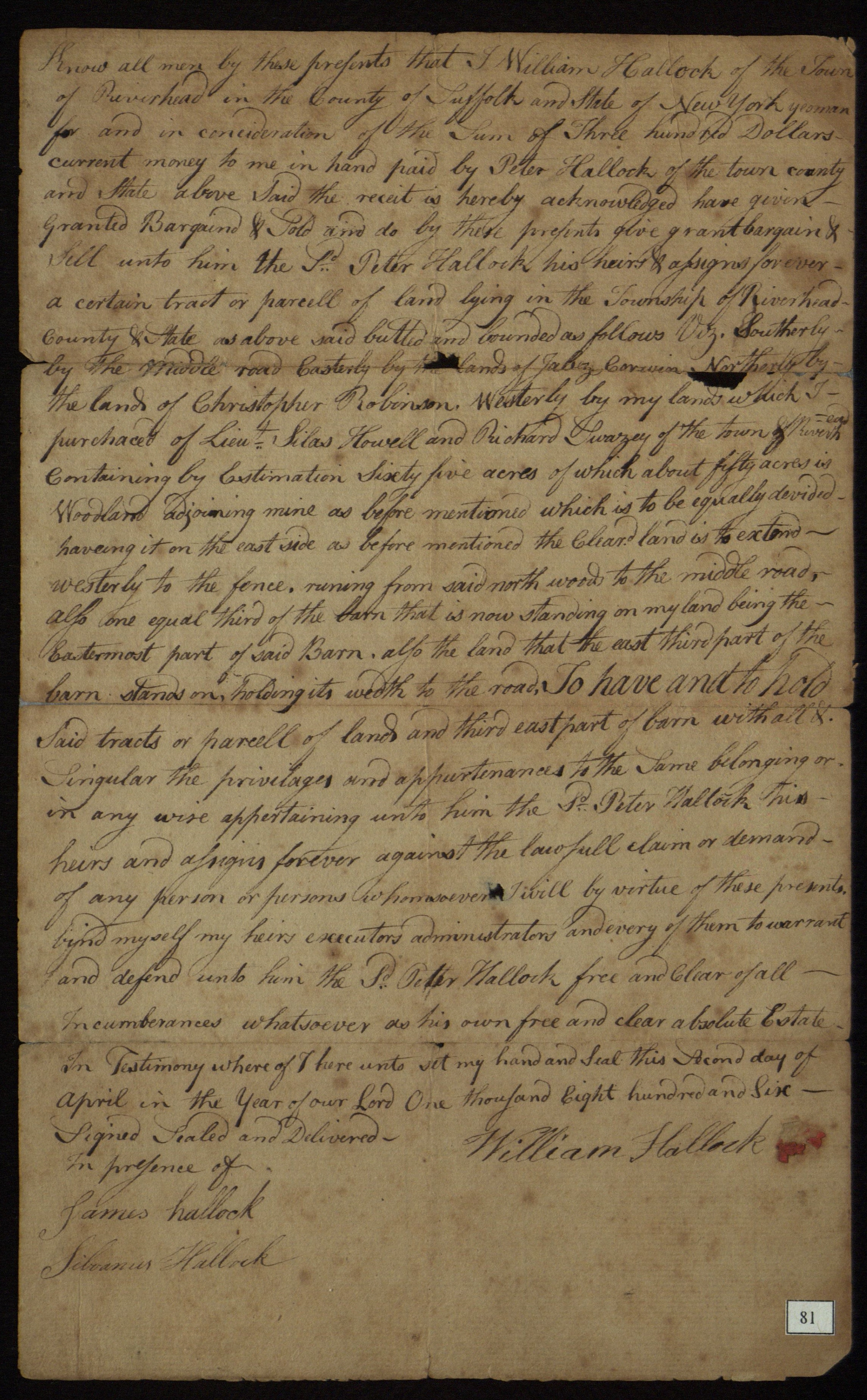 William Hallock's deed to Peter Hallock, Riverhead, N.Y., 1806