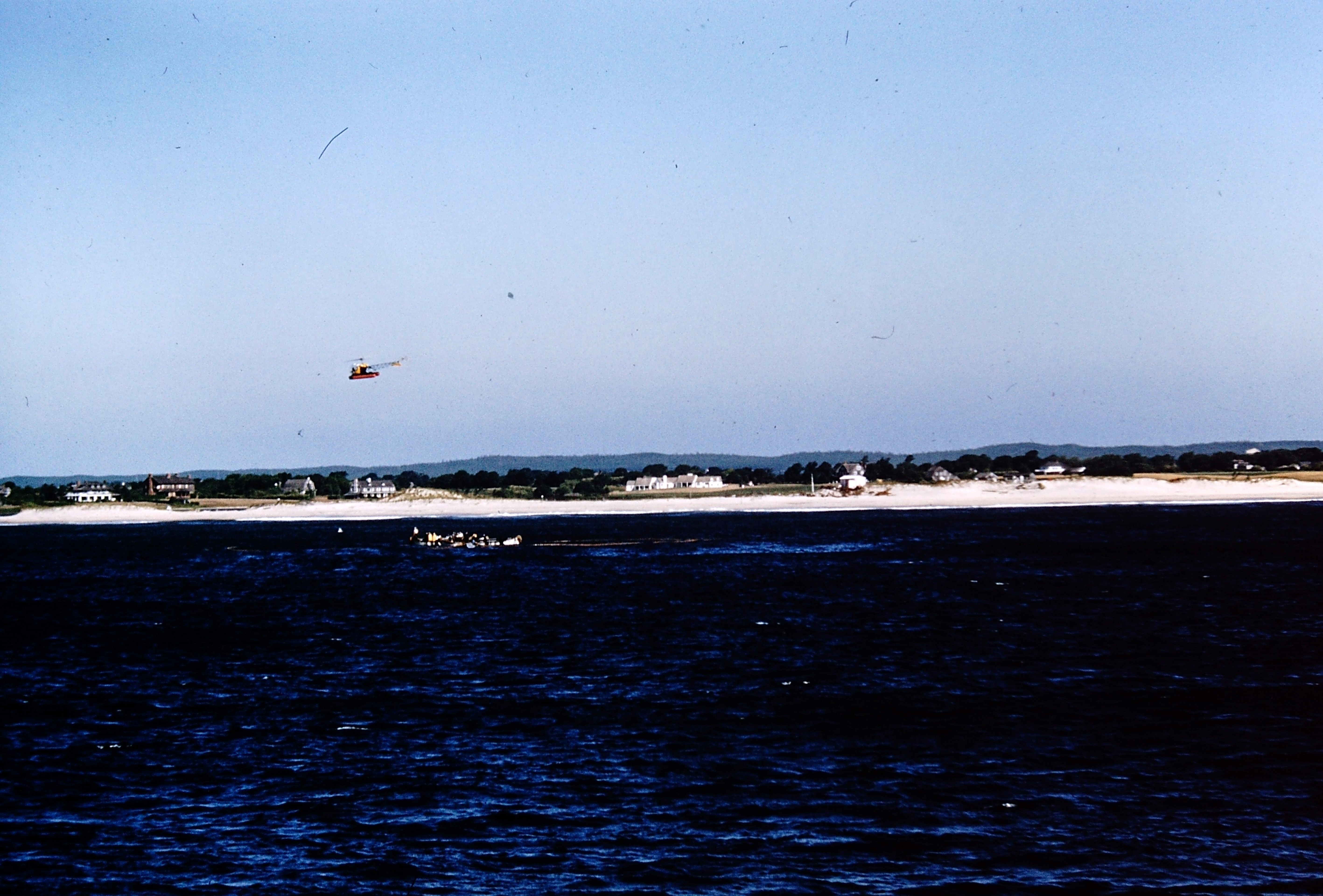 In his History Project, Inc. oral history, Bruce Collins told interviewer Tony Prohaska that he piloted the steamer Shinnecock out of Amagansett for Jack Edwards from 1954 until 1960. That time range is used to date this image. Bruce Collins captioned this image: "A set just made with the help of the company's helicopter flown by Charles Smith the company's helicopter pilot. Note how close to the beach we were." Bruce indicates elsewhere how the process of setting a purse net worked, and the fish factory here was Smith Meal Company at Promised Land. Other similar images indicate this coastline is in East Hampton, and probably along the ocean shoreline.