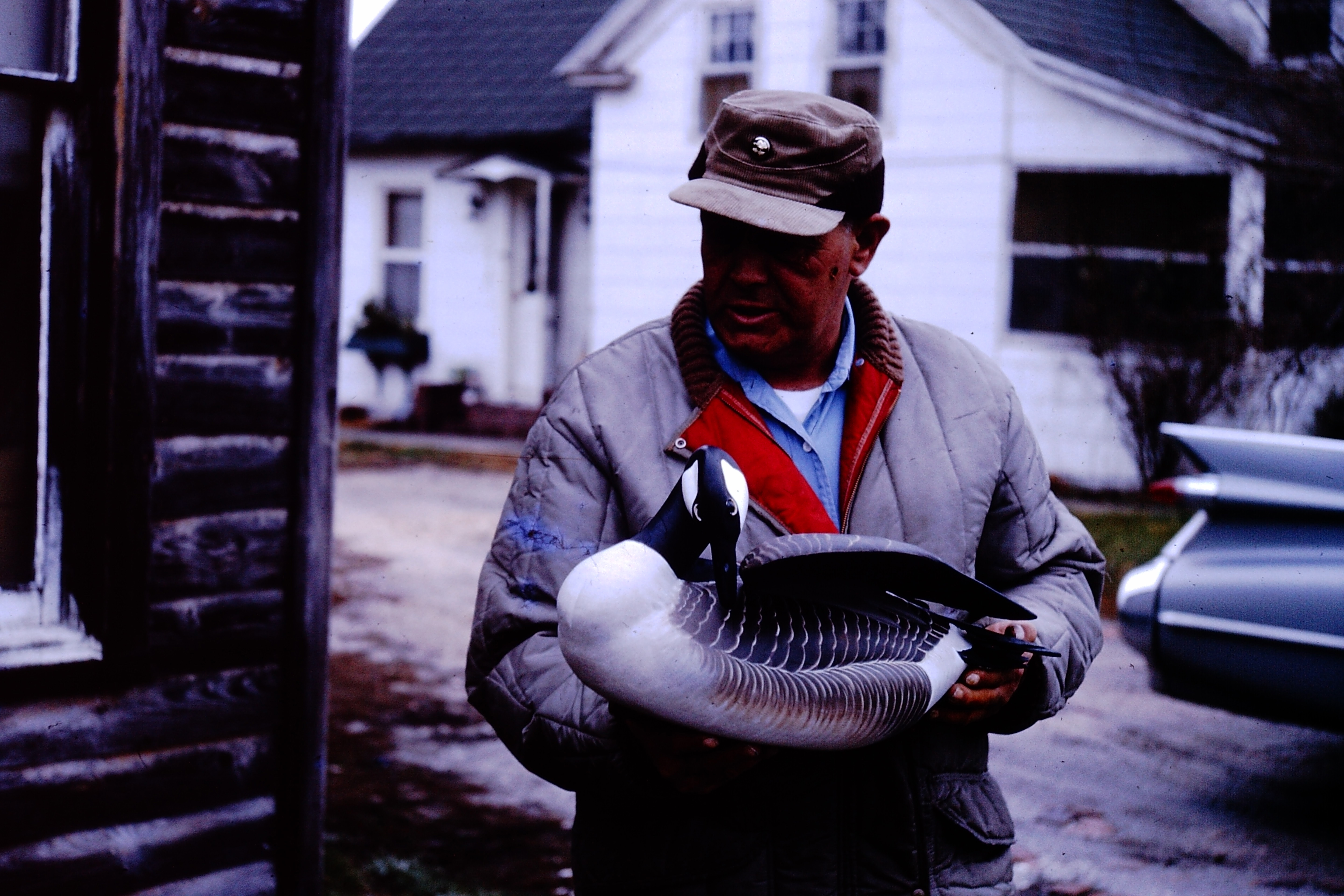 Bruce Collins captioned this image, "Bill Jacobs at Ward Brothers with Preening Goose Decoy Crisfield, Maryland." These images are part of a series of photos Bruce Collins took from his hunting trips to Tangier Island and Crisfield, Maryland. In many of the photographs, Robert Crockett, a Tangier Island waterman (or bayman) appears, along with his brother Peter Crockett. In his History Project, Inc. oral history, Bruce Collins told interviewer Tony Prohaska that he piloted the steamer Shinnecock out of Amagansett for Jack Edwards from 1954 until 1960. That date is used to estimate the date for these images. In other images, Bruce Collins explained that many of the Bunker Boats from Promised Land would head south for winter repairs along the Chesapeake, often continuing to fish at points south. Many of the employees of Promised Land also came from areas along the Chesapeake.