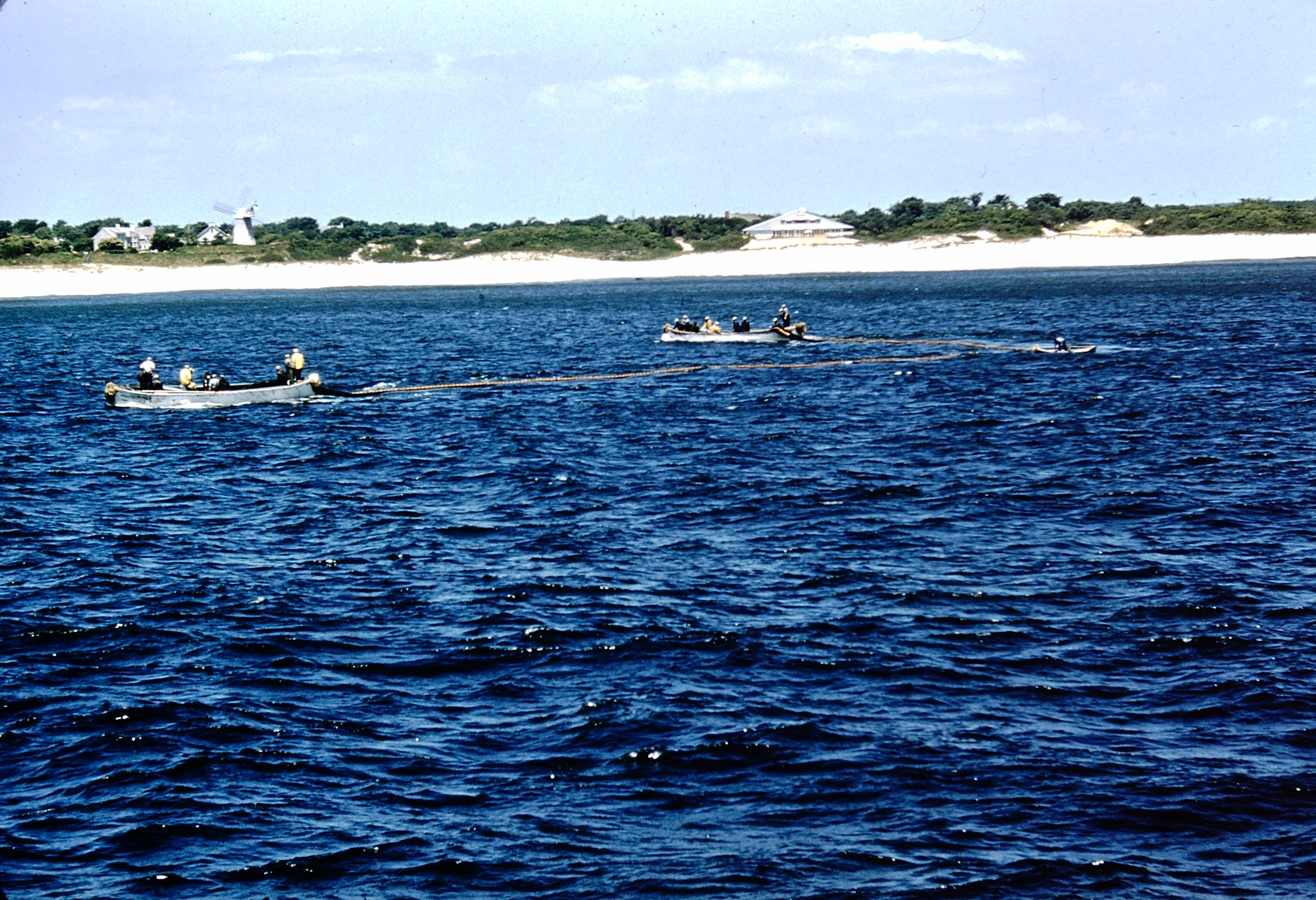 In his History Project, Inc. oral history, Bruce Collins told interviewer Tony Prohaska that he piloted the steamer Shinnecock out of Amagansett for Jack Edwards from 1954 until 1960. That time range is used to date this image. Bruce Collins describes this image as "Set being made on the back side (term used by commercial fishermen for the ocean from the earliest das also sometimes call the south side). Collins points out William Simons Windmill along the coastline. The set is a refernce to the gathering of the purse nets, described in other images.