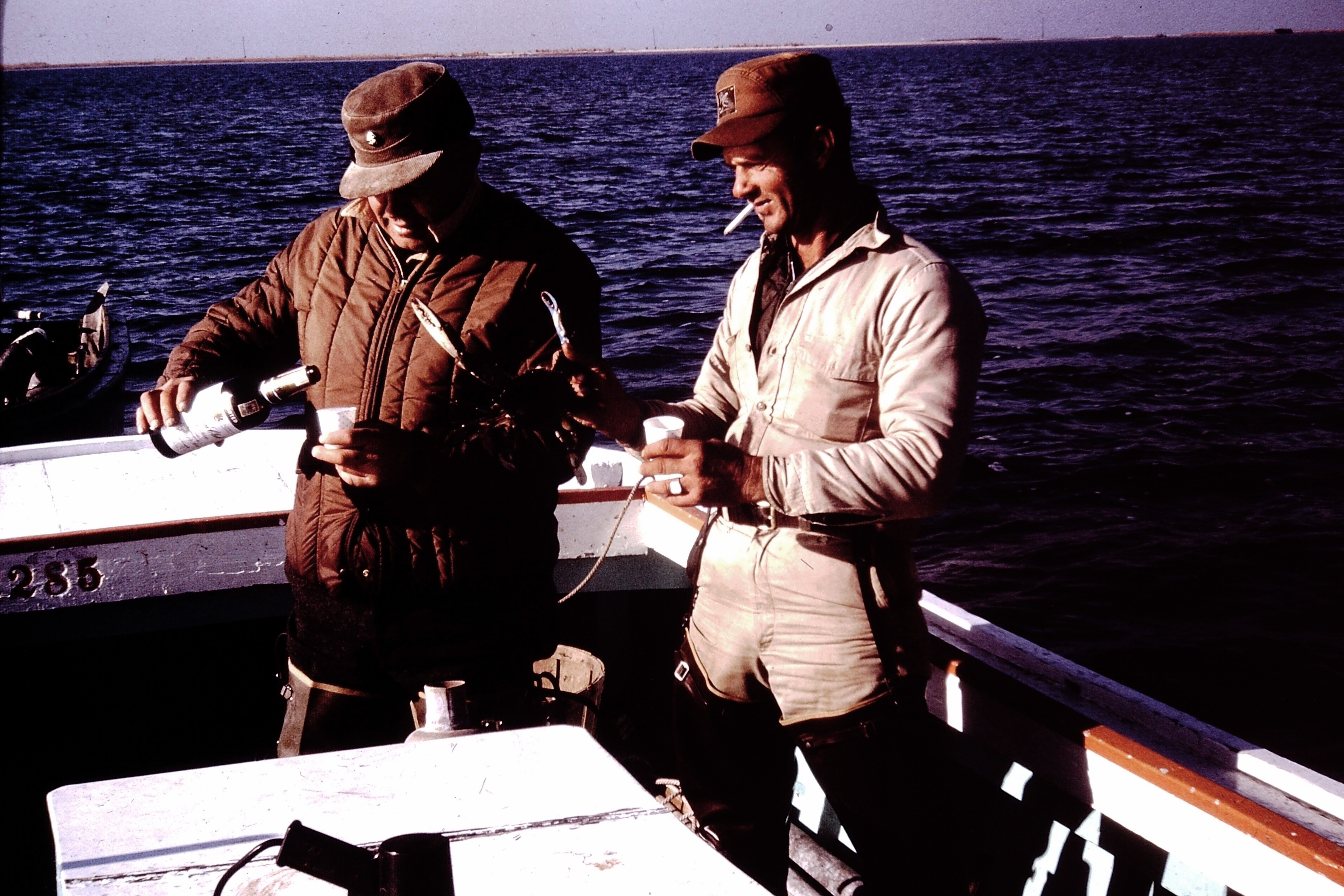 These images are part of a series of photos Bruce Collins took from his hunting trips to Tangier Island. In many of the photographs, Robert Crockett, a Tangier Island waterman (or bayman) appears, along with his brother Peter Crockett. In his History Project, Inc. oral history, Bruce Collins told interviewer Tony Prohaska that he piloted the steamer Shinnecock out of Amagansett for Jack Edwards from 1954 until 1960. That date is used to estimate the date for these images. In other images, Bruce Collins explained that many of the Bunker Boats from Promised Land would head south for winter repairs along the Chesapeake, often continuing to fish at points south. Many of the employees of Promised Land also came from areas along the Chesapeake. Topping was from the East End but Peter Crockett was part of the Crockett family of Tangier Island. Also appearing from this same series on this boat are William Jacobs from East Hampton and Robert Crockett.