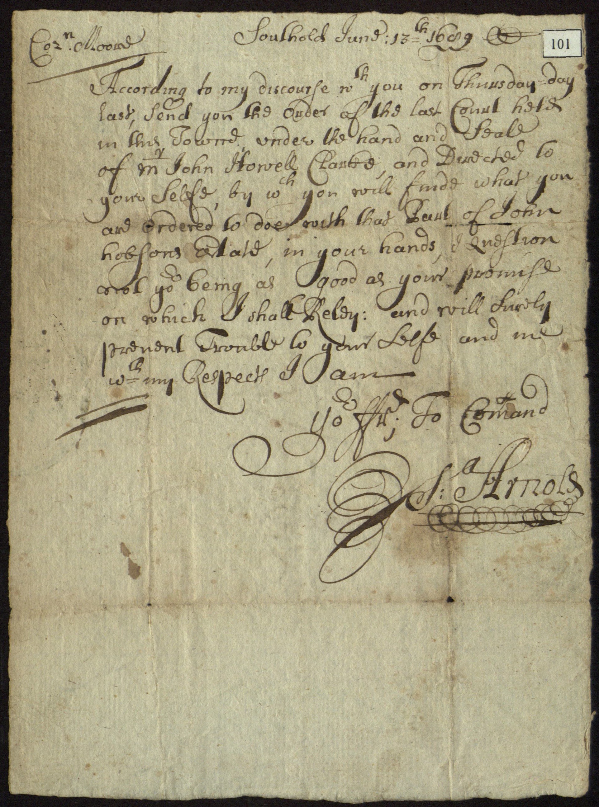 Letter from S. Arnold [Suffolk County, N.Y. Justice of the Peace] to Mrs. Martha Moore, regarding the settlement of John Hobson's estate in the court of Mr. John Howell; June 13, 1689. Not clear as to township residence of John Hobson, nor court location (could be Southampton or East Hampton Townships, N.Y.).