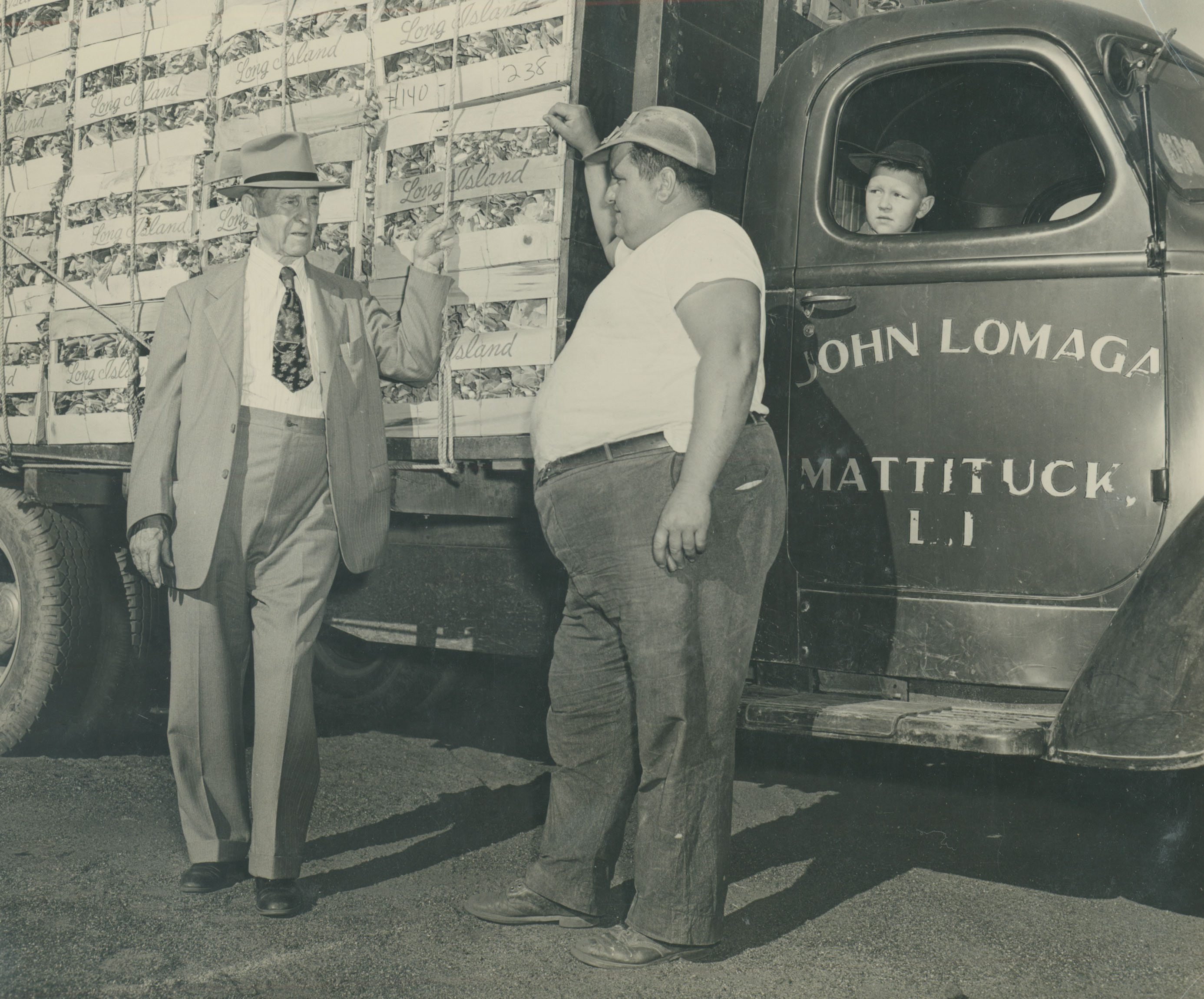 Dwight Corwith, manager of the L.I. Cauliflower Growers Association, shown with John Lomagas of Mattituck, while his son George watches from truck.