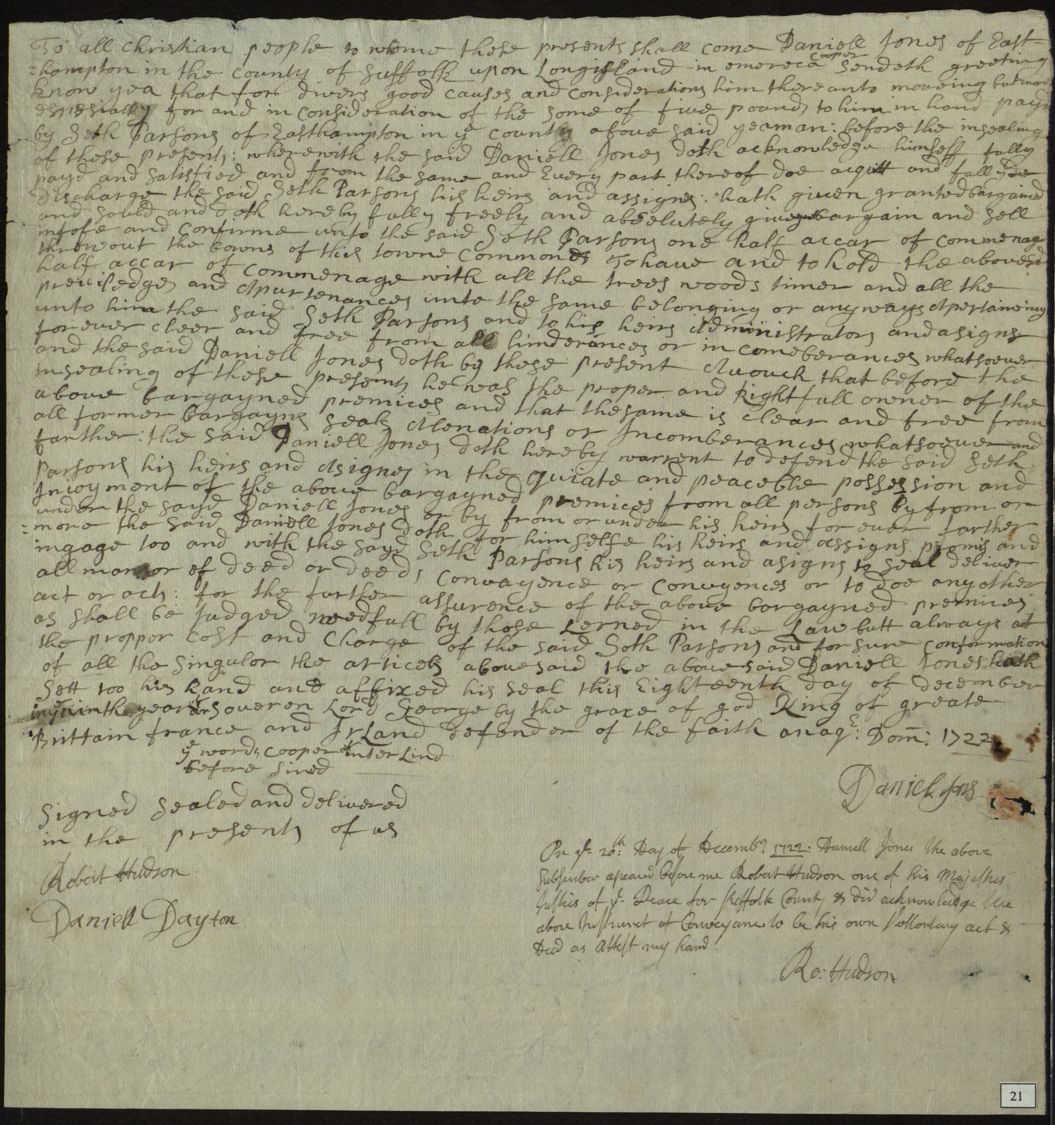 Sale of 1/2 acre right of commonage throughout East Hampton Township, N.Y., by Daniel Jones, cooper, to Seth Parsons [Jr.], yeoman; December 18, 1722. 1/2 acre right of commonage, "with all the trees, woods and timber...," witnessed by Robert Hudson and Daniel Dayton, executed by Suffolk County, N.Y. Justice of the Peace Robert Hudson.