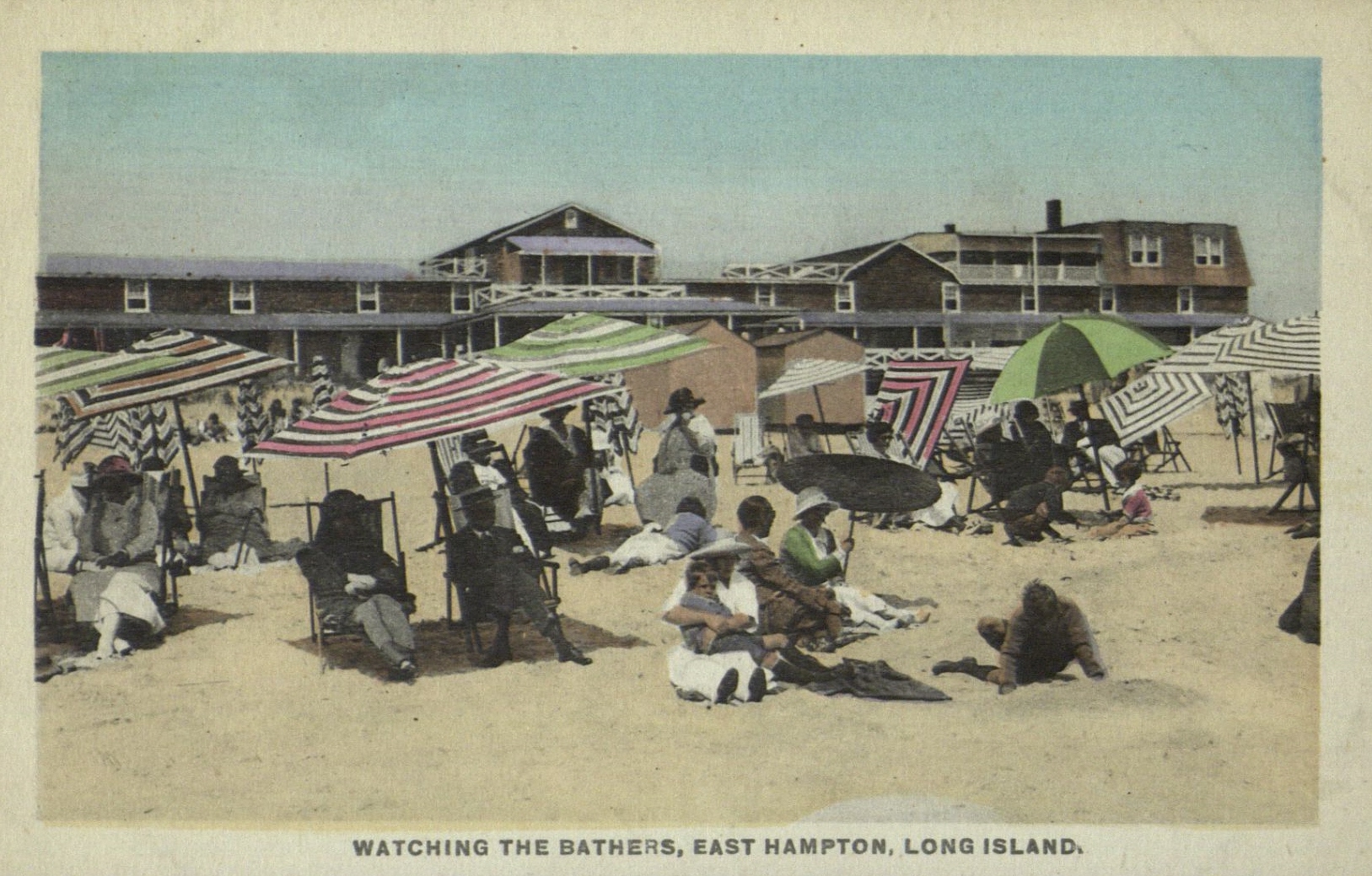 Postcard image of people at the beach, in East Hampton, L.I.