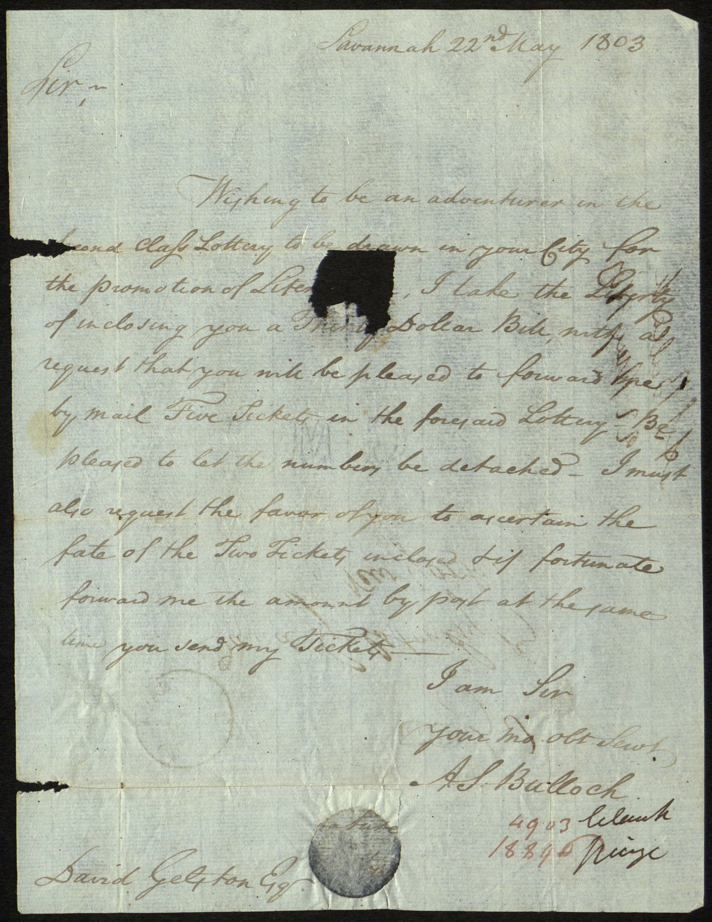 Letter to David Gelston (1744-1828), Collector of the Port of New York (1801-1820), from A.S. Bullock, May 22, 1803. [David Gelston was a native of Bridgehampton, the son of Maltby Gelston, who was chairman of the Committee of Safety of Suffolk. David Gelston was sent by his father, to Governor Trumbull of Connecticut to ask for a part of the Connecticut Militia to defend Long Island. He also was a member of the 2nd, 3rd, and 4th provincial congresses, and was one of the petitioners for a wharf at Sag harbor.]