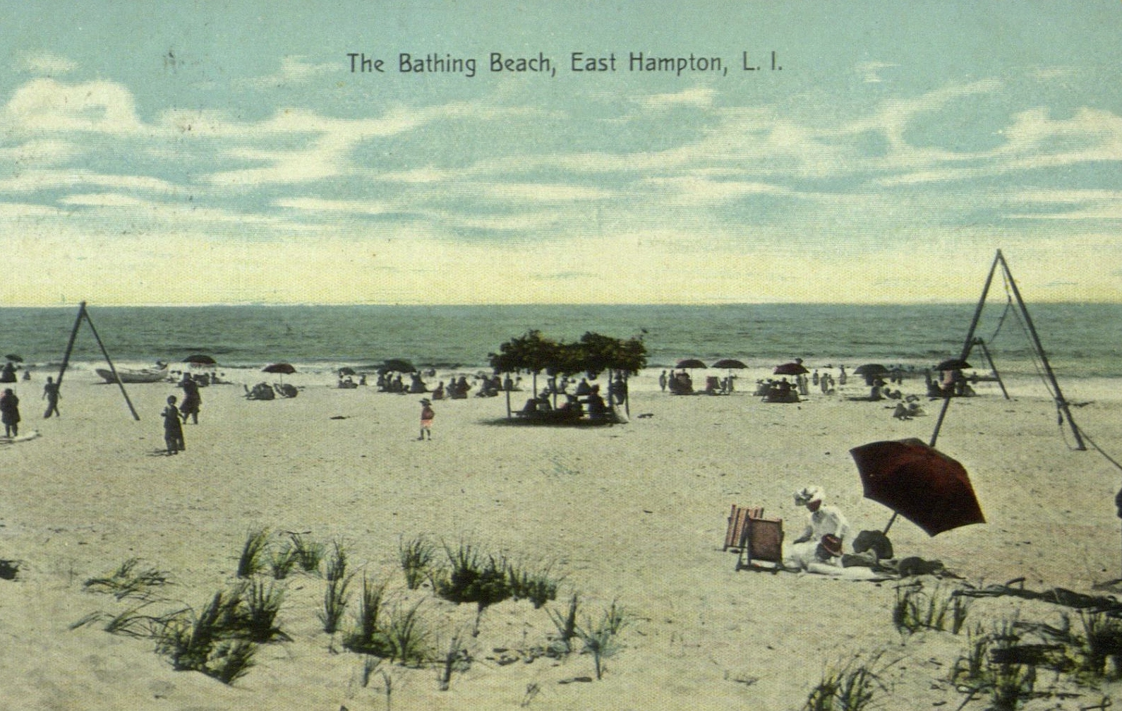 Postcard image of people at the beach, in East Hampton, L.I.