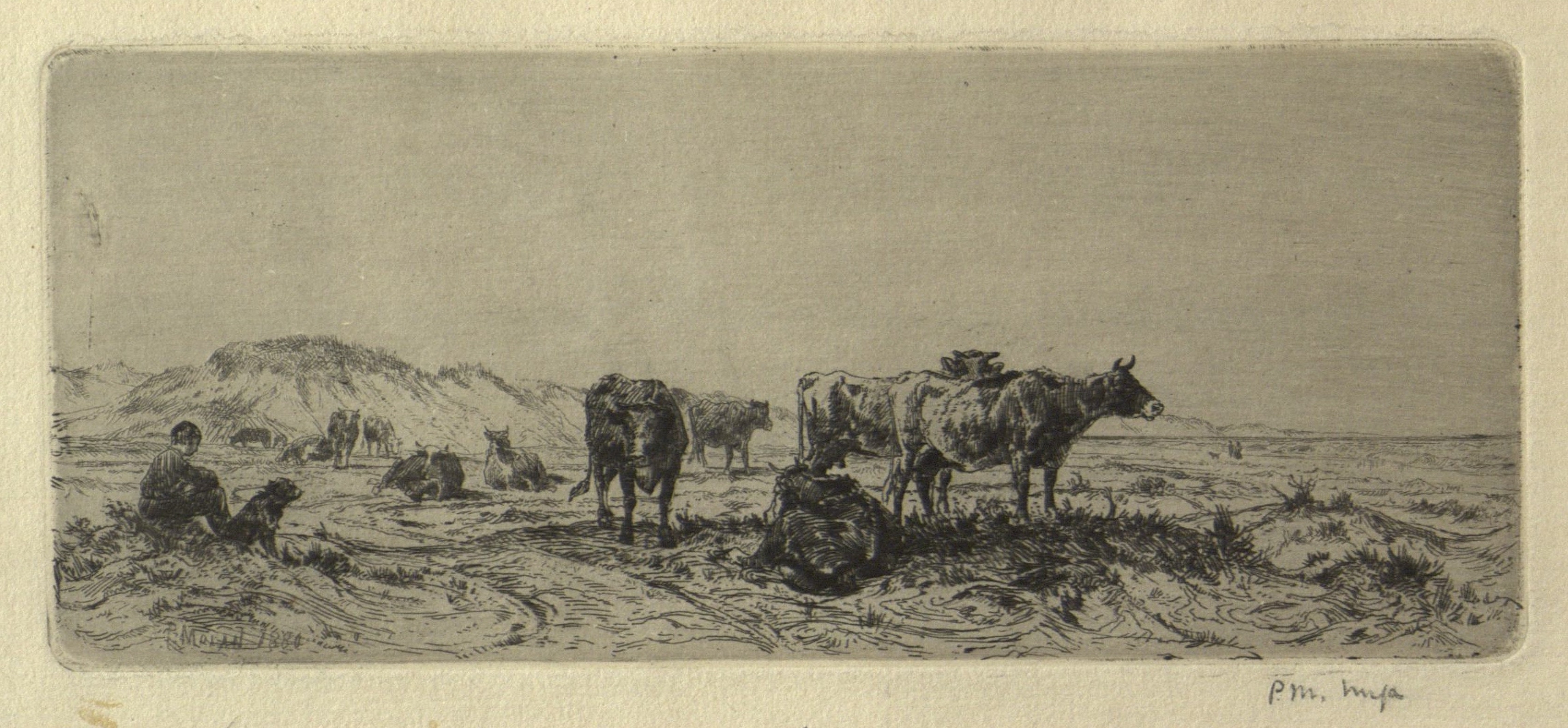 Signed etching of cattle in the field, with a boy and dog, taking a rest at noon, by Peter Moran.