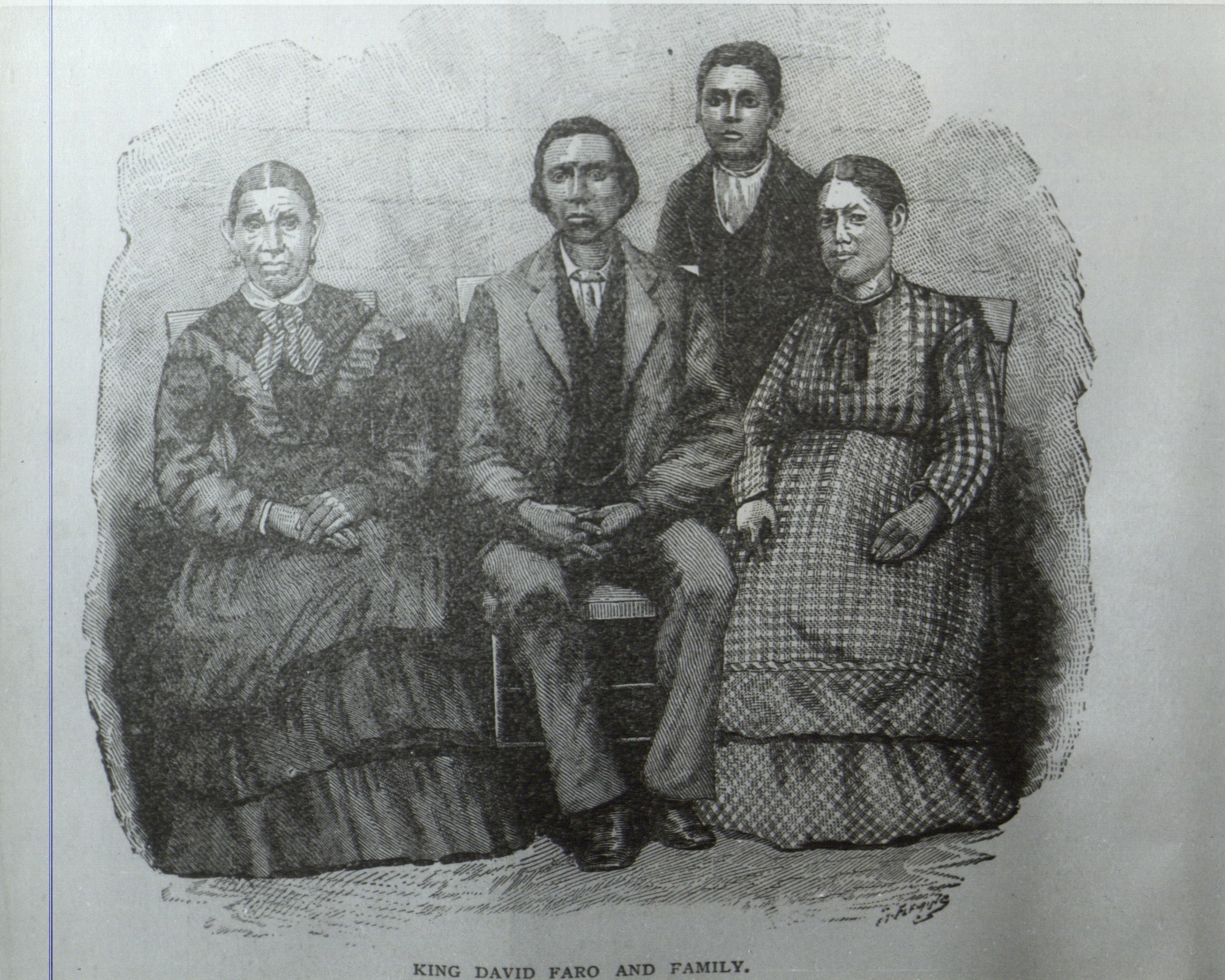 Caption on back of photograph reads: "This very rare sketch of the Montauk royal family was made in 1879 by an artist who visited King David Pharoah and his family at their cabin in Indian Field, the old reservation. King David was on his deathbed at the time and refused the artist permission to sketch him but allowed him to sketch a photo at the foot of the bed from which this sketch was taken. The woman on the left is King David's mother. King David is seated in the middle, his wife Maria is on the right. In the rear standing is his son Wyandank who, upon his father's death became the king of the tribe. Wyandank was nine when this sketch was taken."