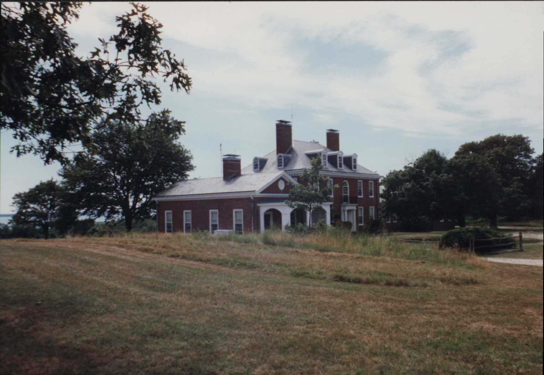 The Gardiner's Island Manor House is seen from a distance, with a focus on the portico to the side of the front This is the Manor House built by Sarah Diodati Gardiner in the mid-20th century.