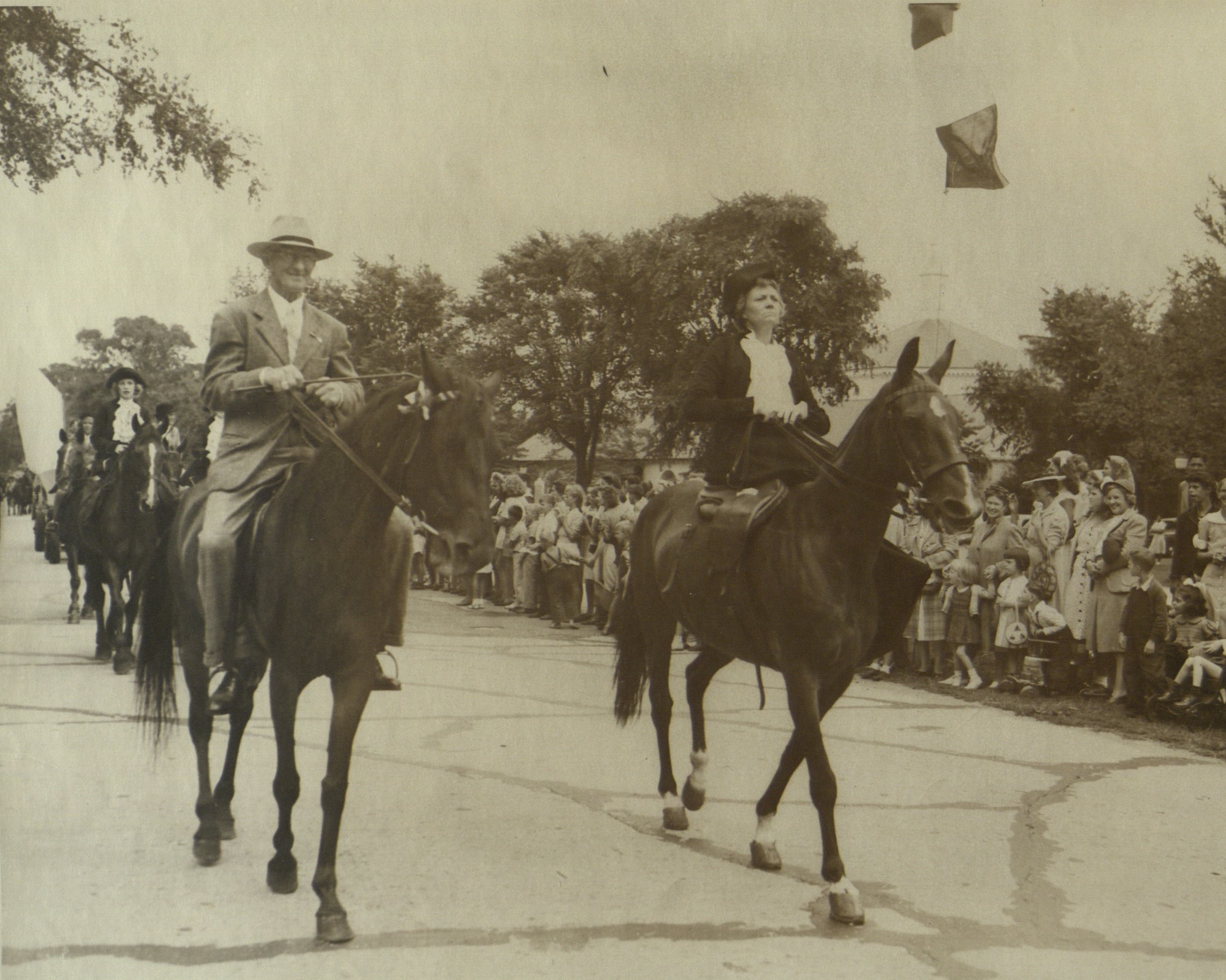 Emil Gardell and Hallie Schenck riding horseback, in the Ladies Village Improvement Societies 50th Anniversary Parade.