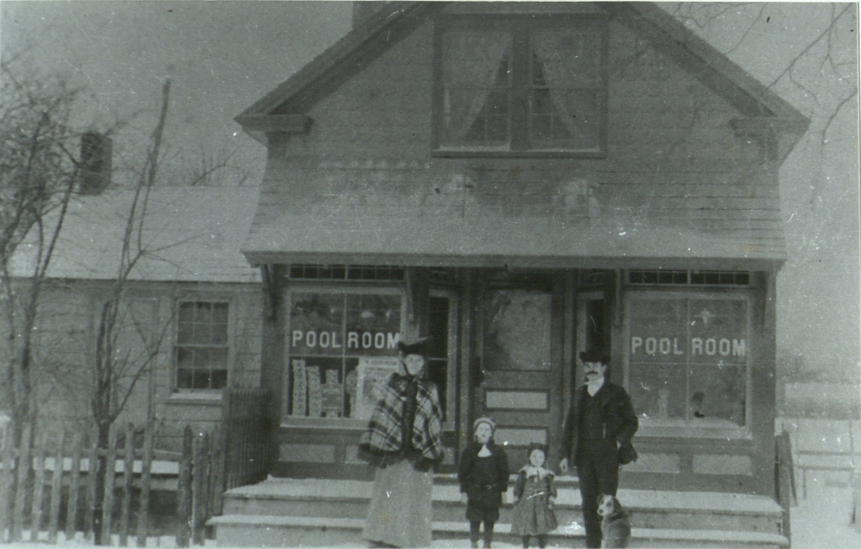 Caption on reverse reads: This building, owned by Mr. Joseph Loris, stood on Newtown Lane, on what is now the entrance to the Reutershan Parking Lot. It was later used as a Chinese laundry, and eventually destroyed by fire. Copy by C. Frank Dayton.