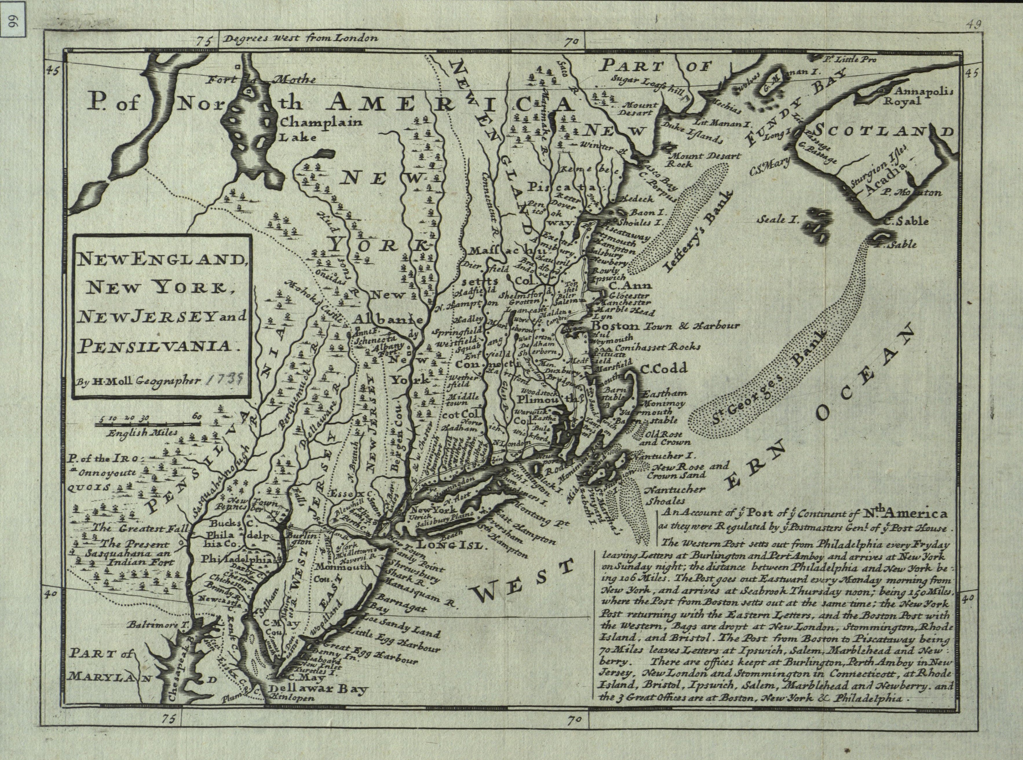 North America / according to observations by H. Moll, Geographer. New England, New York, New Jersey and Pensilvania, by H. Moll, geographer, 1739. An account of ye post of ye continent of North America as they were regulated by ye Postmasters General of ye Post House.