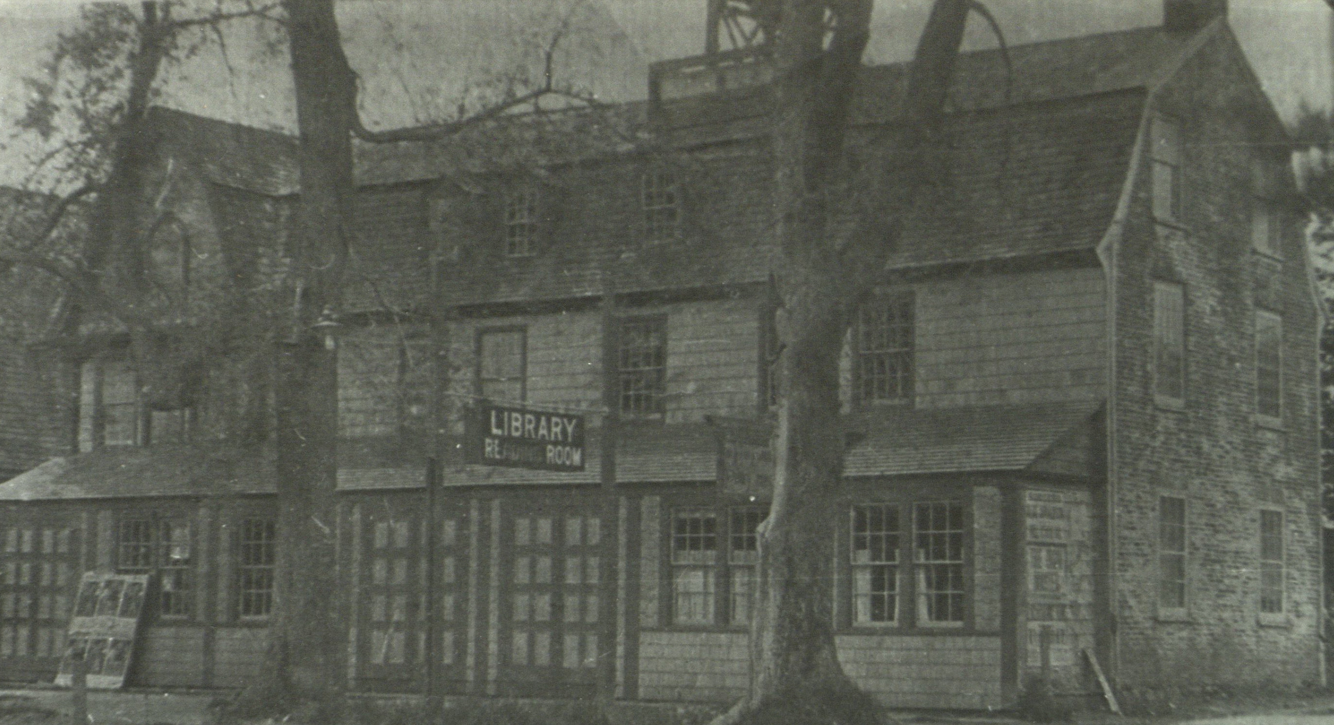 The Library moved to Clinton Hall. As the book collection grew, various rooms were made available. Caption on reverse reads: Notice the posters pasted on a billboard and at the end of the building advertising a coming traveling show. Copy by C. Frank Dayton.