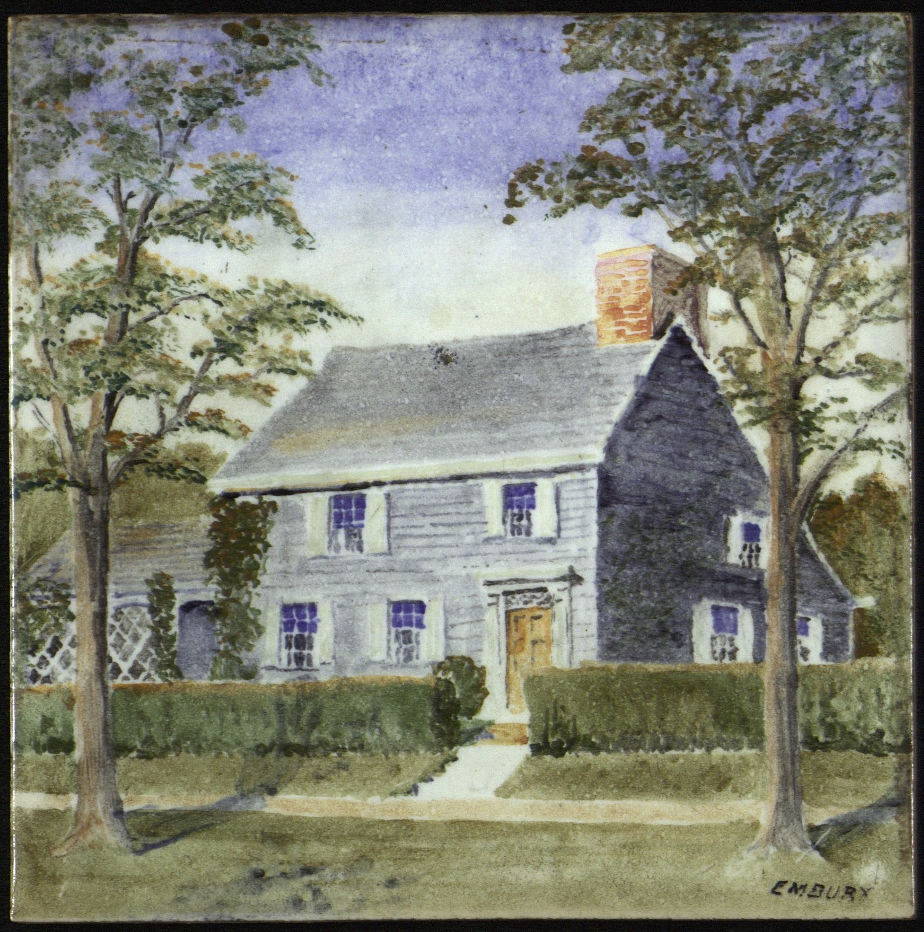 Hand-painted, 6 X 6 in. ceramic tile of the Embury house by Aymar Embury. In 1953, tile painting made a resurgence in East Hampton. The artist Maude S. Jewett, known best for her sculpture, asked nine artists to each paint a tile. The finished tiles were then placed in a table-top at the East Hampton Library. The table no longer exists, but the tiles still do.