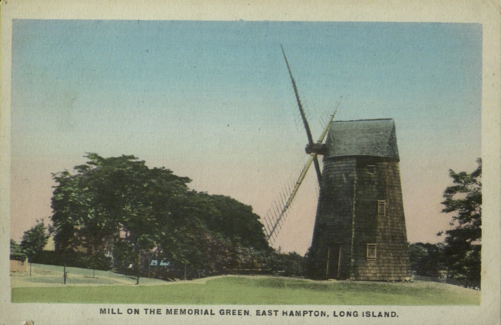 Postcard image of the Old Hook Mill and Memorial Green, in East Hampton, L.I.