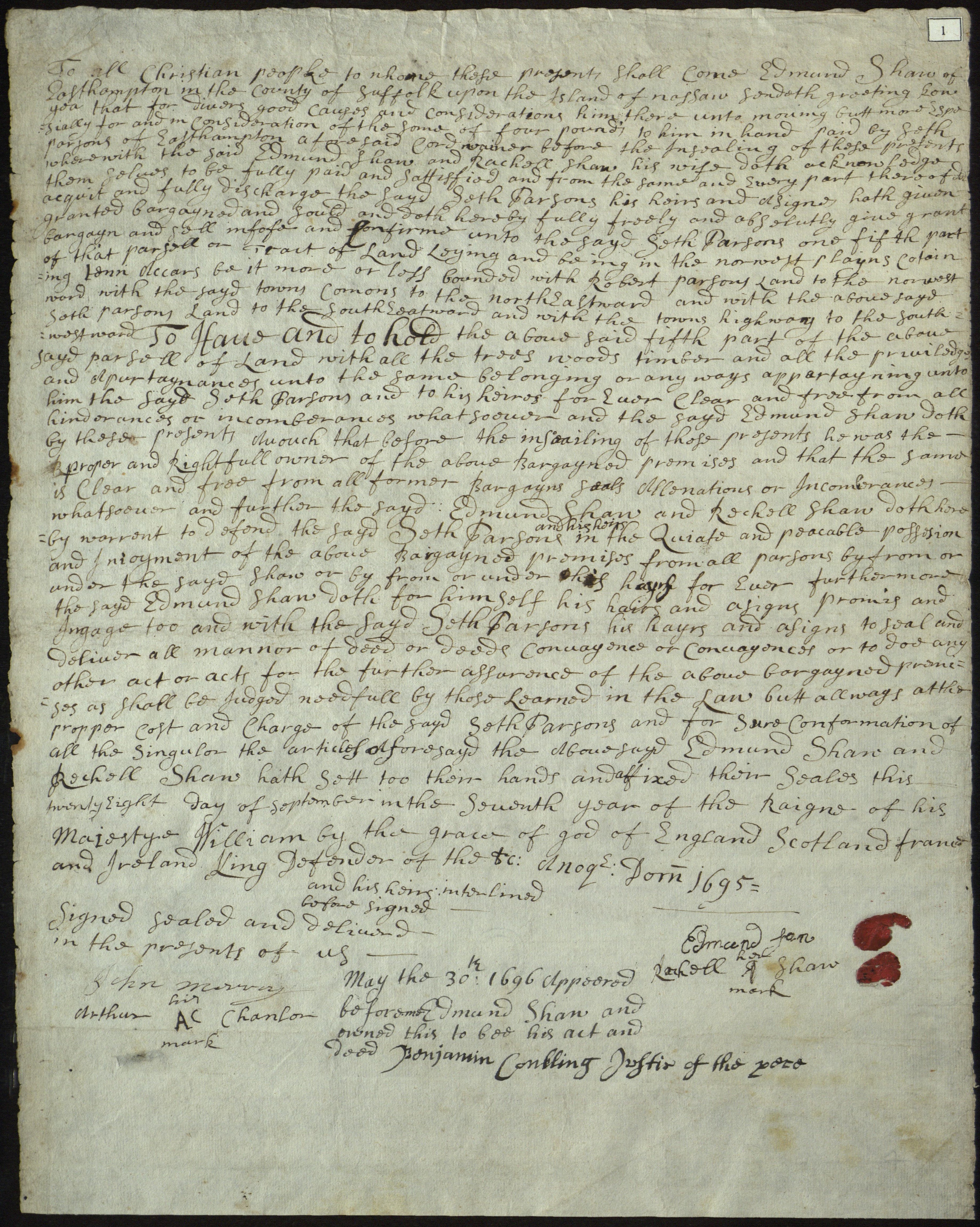 Sale of parcel in the Northwest Plains, in East Hampton Township, N.Y., by Edmund Shaw [and wife Rachel Shaw] to Seth Parsons, cordwainer; September 28, 1695. 10 acre parcel, bounded on the northwest by land of Robert Parsons; witnessed by John Merry and Arthur Chandler, executed by Suffolk County, N.Y. Justice of the Peace Benjamin Conkling.