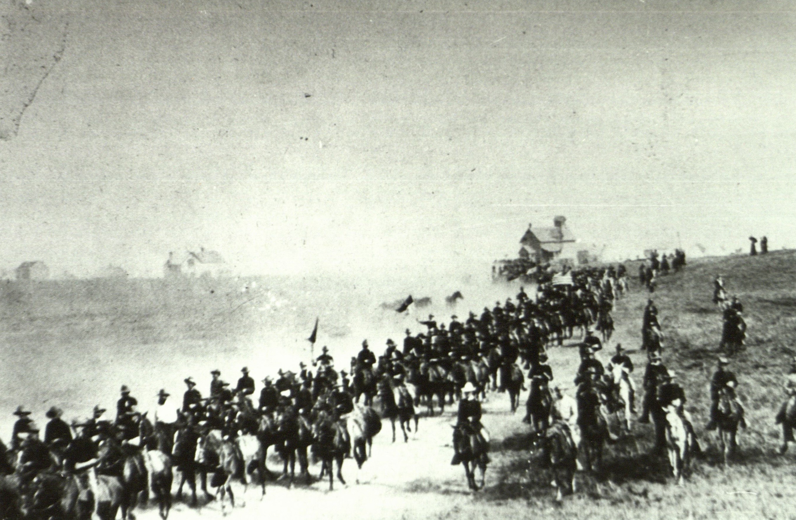 Caption on reverse reads: Cavalry at Camp Wikoff, Montauk, 1898. Roosevelt in light uniform at lower right. Copy by C. Frank Dayton.