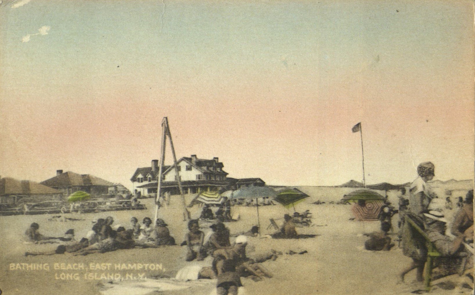 Postcard image of people at the beach, in East Hampton, L.I.